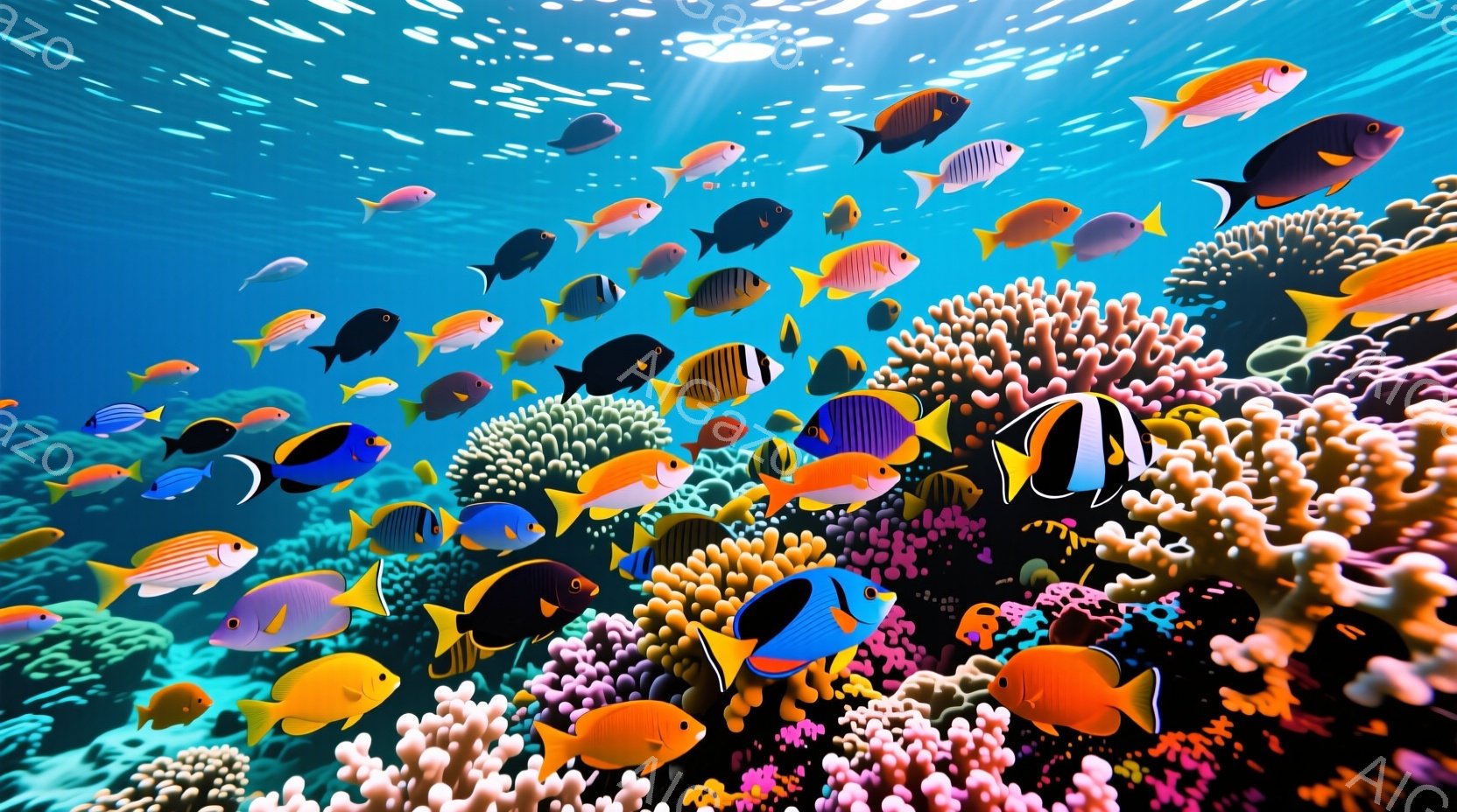 カラフルな熱帯魚がサンゴ礁の間を群れをなして泳いでいる様子が描かれています。サンゴはピンクやオレンジ色で、多様な形をしており、水中に生き生きとした色彩と生命感をもたらしています。青い水面には光が差し込み、魚やサンゴのシルエットを強調し、穏やかで幻想的な雰囲気を醸し出しています。
