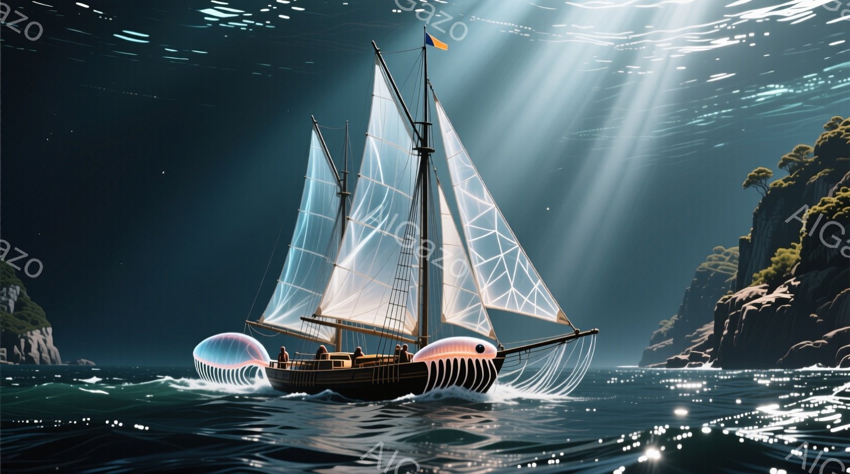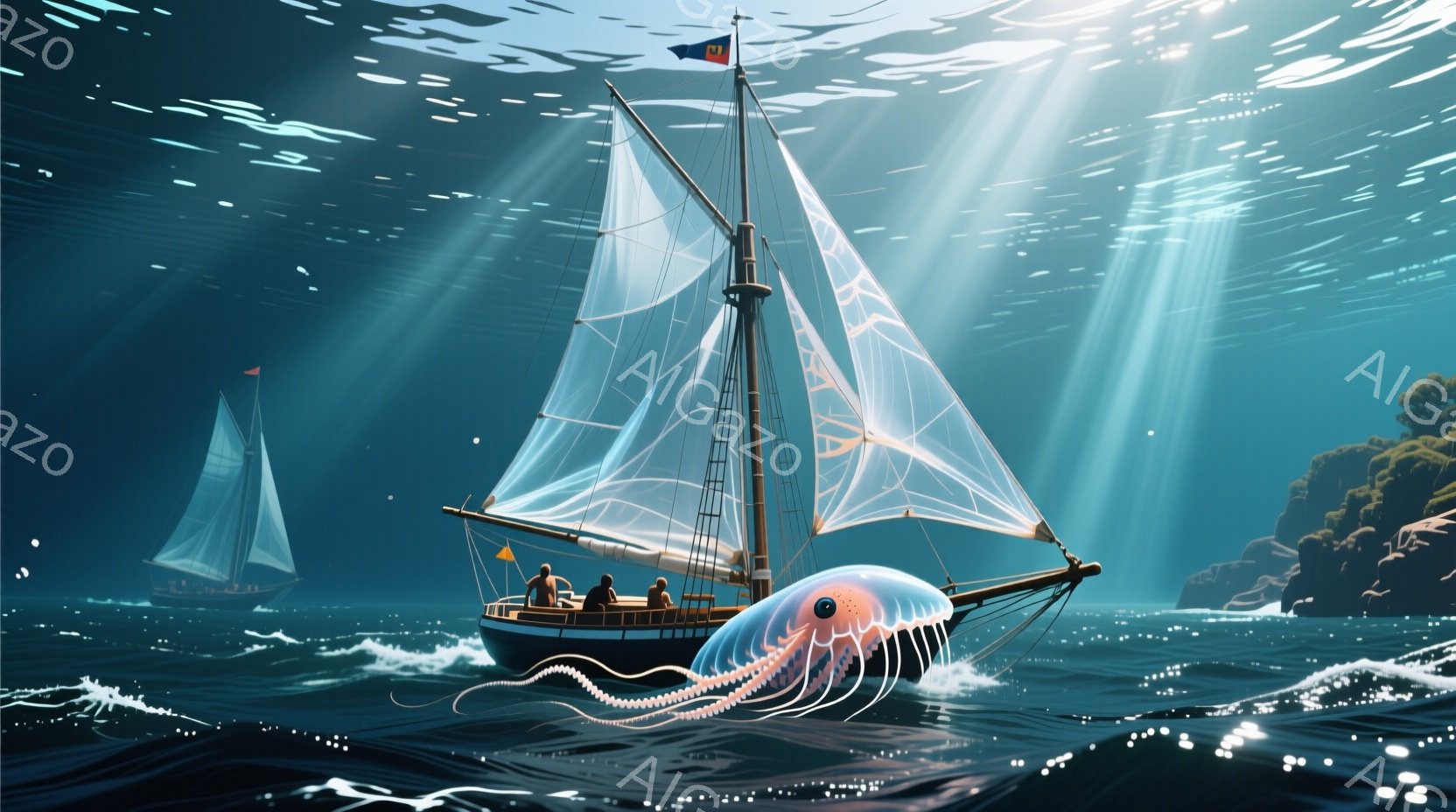この無料AI生成画像「ひげを生やした男性が、巨大なクラゲを船に見立てて海中を進んでいる。クラゲの傘の部分が帆の役割を果たし、男性はオールで操縦しているように見える。背景は青い海中であり、光線が差し込み幻想的な雰囲気を醸し出している。」は、2025年10月23日に作成されました。 サイズは 1664×928px の高解像度で、商用利用も可能なフリー素材として提供しています。