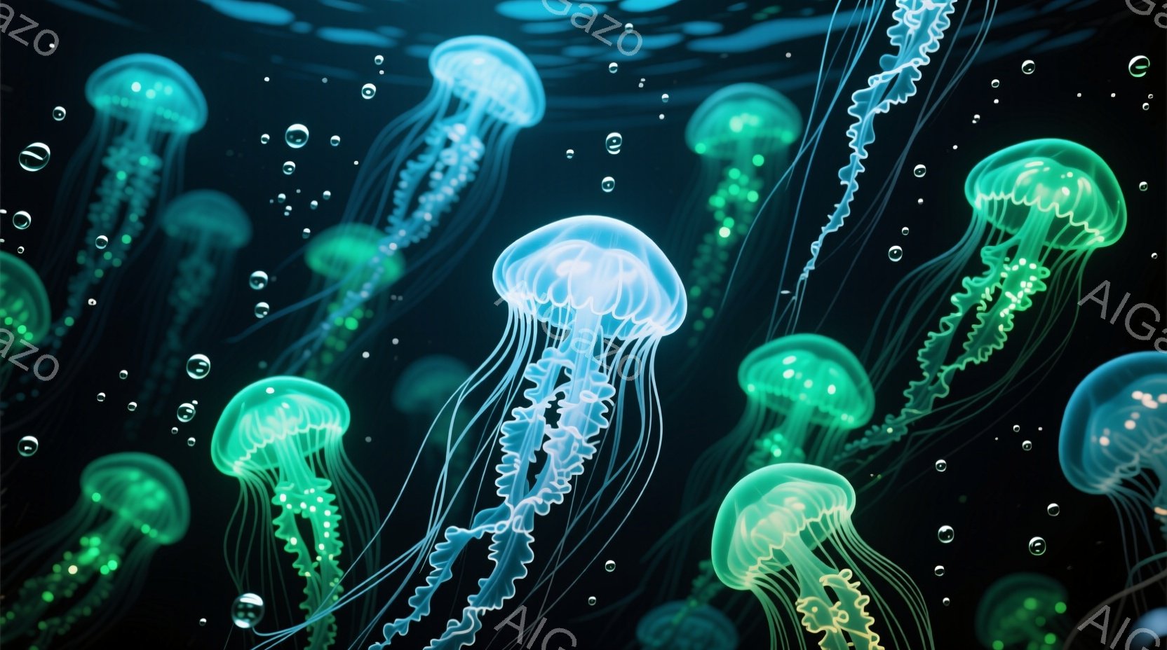 深い紺色の背景に、発光する水母が多数漂っている様子が描かれている。水母は淡い緑色を帯びており、触手は繊細で複雑な模様を形成し、まるで水中を舞う妖精のようだ。周囲には小さな泡が散りばめられ、神秘的で幻想的な雰囲気を醸し出している。