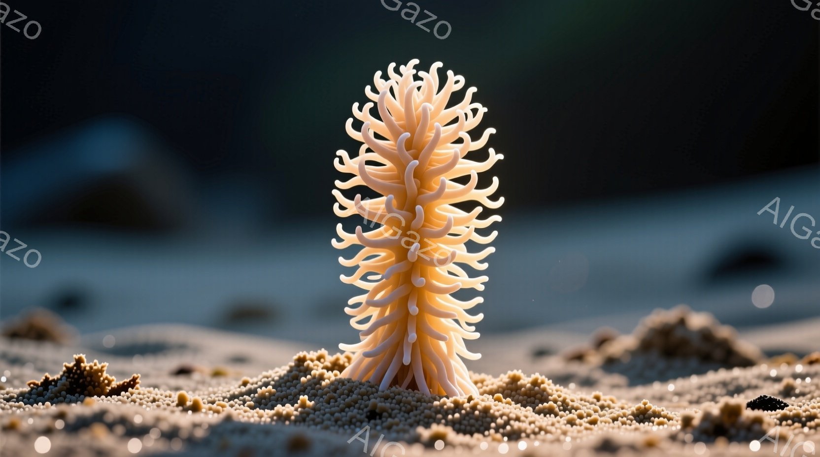砂浜に生えたような、複雑な形状の珊瑚のようなオブジェクトを捉えている。オレンジ色の根元から、白い繊細な枝が放射状に広がり、まるで植物のような、あるいは芸術作品のような外観を見せている。背景はぼやけており、砂浜の質感が強調され、神秘的で夢幻的な雰囲気を醸し出している。