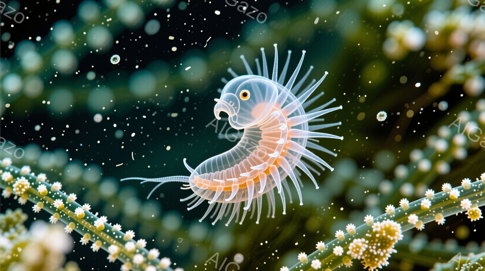鮮やかな緑色の背景に、オレンジと白の小さな生物が中央に配置されています。この生物は、長い触覚と、全身に並んだ繊細な毛のような構造を持ち、まるで小さな海の生き物のようです。背景には、ぼやけた黄色の花のようなものが散りばめられており、全体的に幻想的で神秘的な雰囲気を醸し出しています。