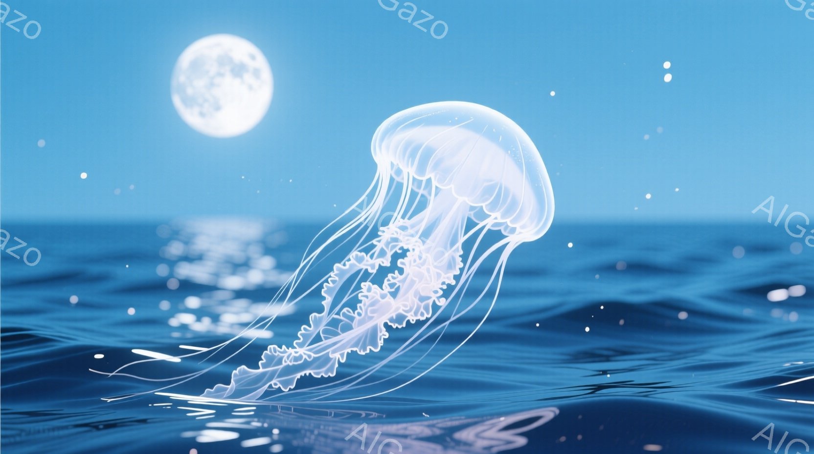 青い海の中に、光り輝くクラゲが漂っている。月明かりが海面を照らし、波の反射がキラキラと輝き、幻想的な雰囲気を醸し出している。クラゲの繊細な形状と光のコントラストが、神秘的な美しさを際立たせている。