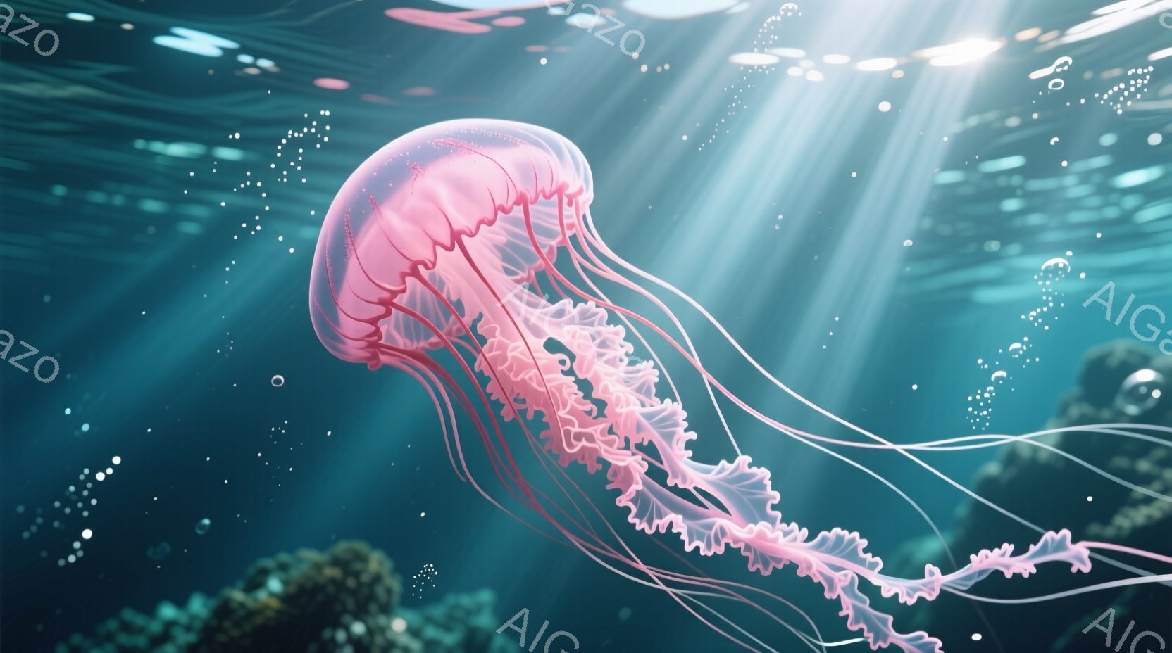 淡いピンク色のクラゲが、青く輝く水中を優雅に漂っている。繊細な触手はまるでレースのように広がり、光の筋が水面から差し込み、幻想的な雰囲気を醸し出している。背景は暗く、水中の浮遊物と光が織りなすコントラストが、神秘的な深海の世界を連想させる。