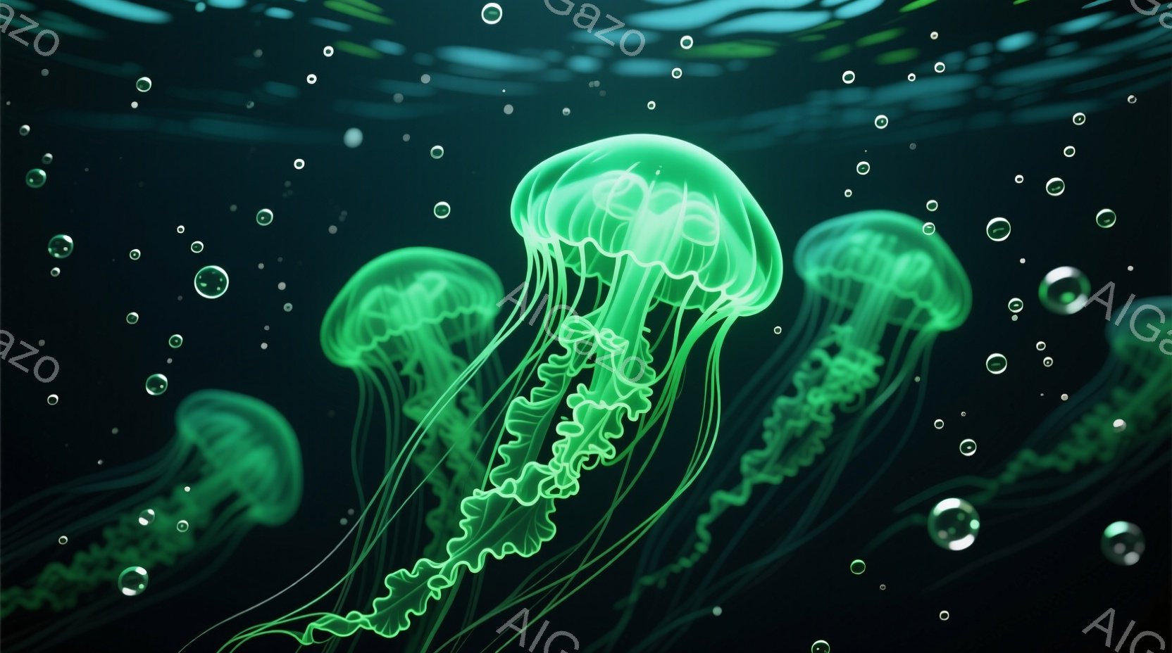 深い藍色の背景に、発光するクラゲが複数漂っている様子が描かれている。クラゲは半透明の緑色で、複雑な触手を長く伸ばし、まるで光の糸を引いているようだ。小さな泡が散りばめられており、深海のような静かで幻想的な雰囲気を醸し出している。