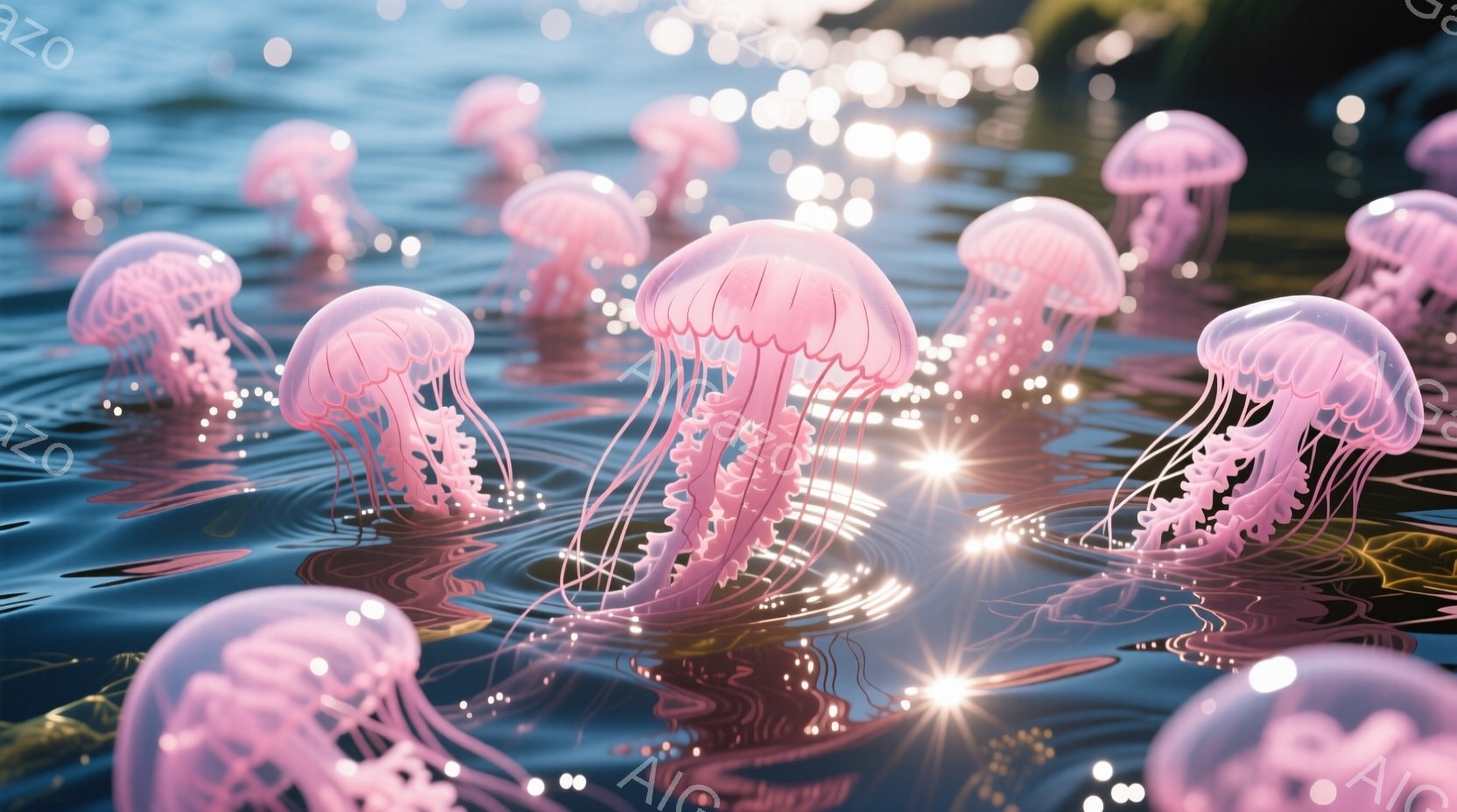 多数の淡いピンク色のクラゲが水面を漂っている様子が描かれています。クラゲは半透明で、触手は細かく波打ち、まるで光の糸のようです。水面にはキラキラと輝く光の粒子が散りばめられ、幻想的で穏やかな雰囲気を醸し出しています。