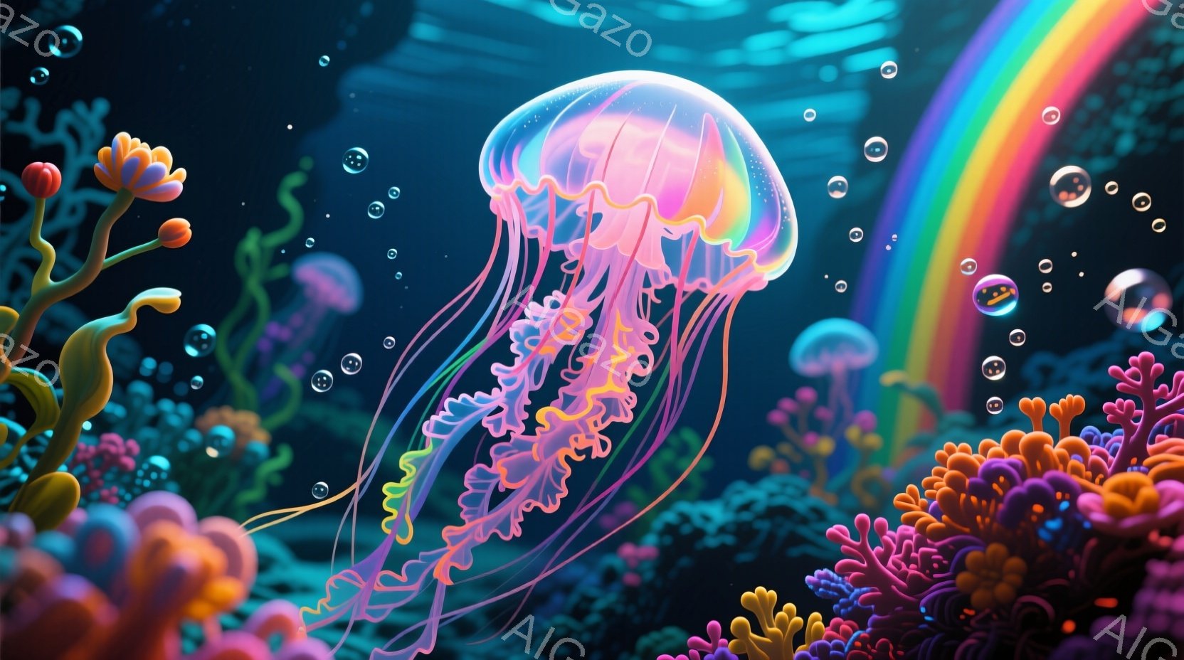 この無料AI生成画像「深い青色の背景に、発光するピンクと紫色のクラゲが多数浮かんでいます。クラゲは半透明で、触手は長く、光り輝く小さな粒子で飾られています。全体的に幻想的で、水中の神秘的な雰囲気を醸し出しています。」は、2025年10月23日に作成されました。 サイズは 1664×928px の高解像度で、商用利用も可能なフリー素材として提供しています。