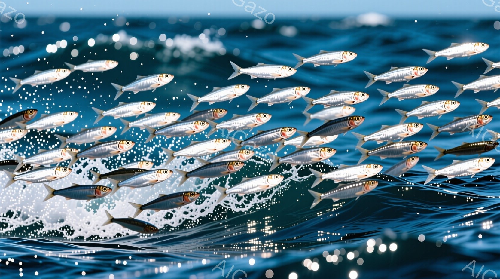 多数のイワシが群れをなし、波間を高速で泳いでいる様子が捉えられています。光が水面で反射し、キラキラと輝き、躍動感あふれるシーンを演出しています。紺碧の海と白い波しぶきが、イワシの銀色の体を一層際立たせています。