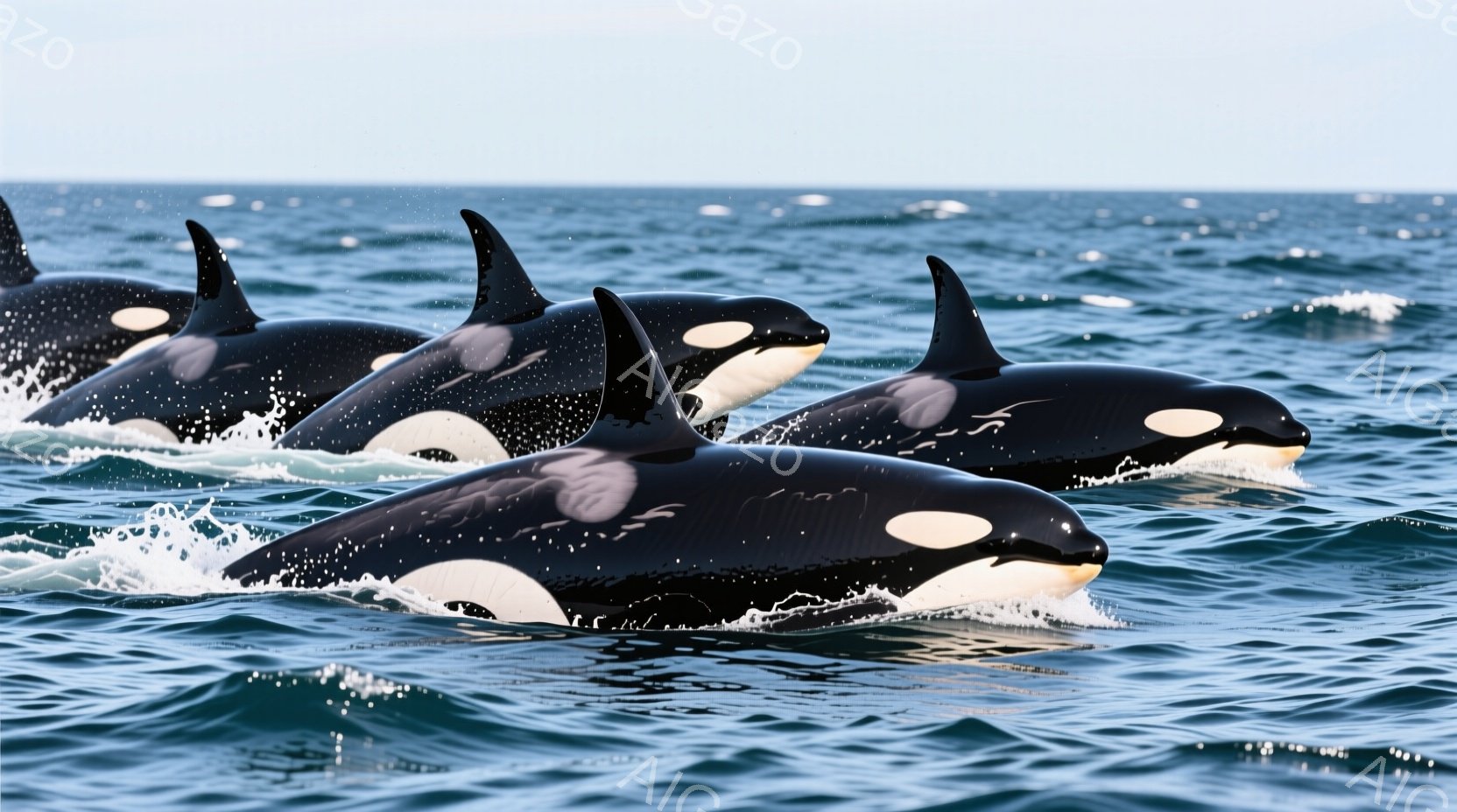 鮮やかな青い海に、複数のシャチが躍動的に泳いでいる様子が捉えられています。黒と白のコントラストが美しいシャチたちは、波しぶきを上げながら力強く海面から姿を現しています。背景には穏やかな海と薄い空が広がり、生き生きとした海の生態系を感じさせる、ダイナミックで壮大な光景です。