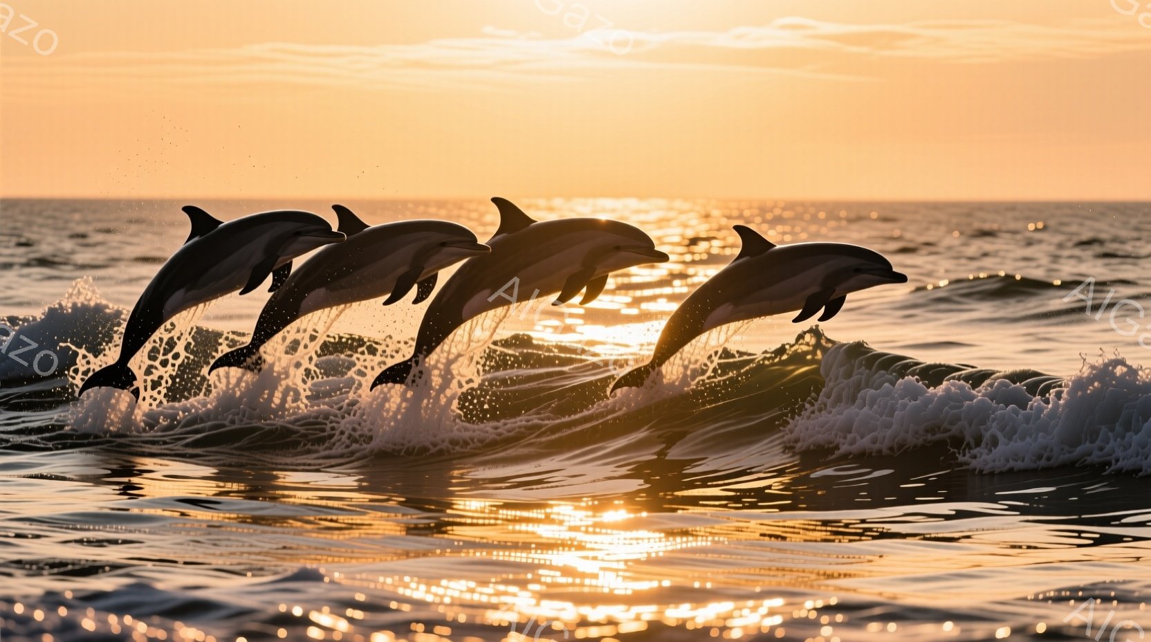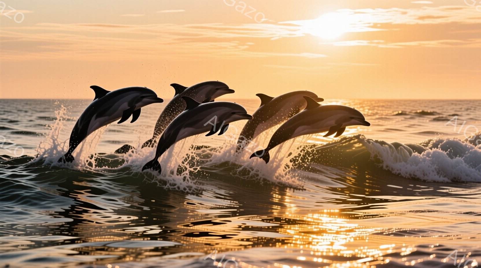 鮮やかな夕焼けを背景に、5匹のイルカが波の上を飛び跳ねている様子が捉えられています。波は白く泡立ち、イルカの躍動感を引き立てています。夕焼けのオレンジ色が海面を照らし、穏やかで力強い雰囲気を醸し出しています。