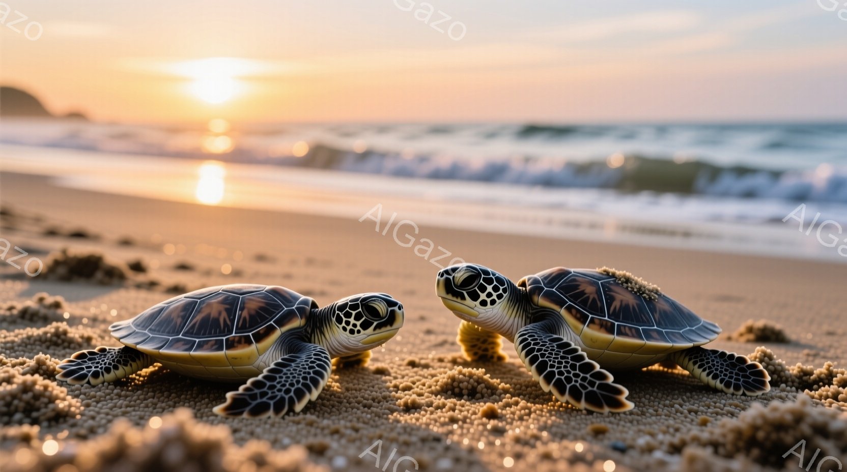 砂浜の上に二匹の幼いウミガメが並んでおり、互いに向き合っている。夕焼けの光が反射した砂浜は黄金色で、穏やかな波が背景に見える。全体的に、温かく穏やかな雰囲気で、生命の誕生や希望を感じさせる。