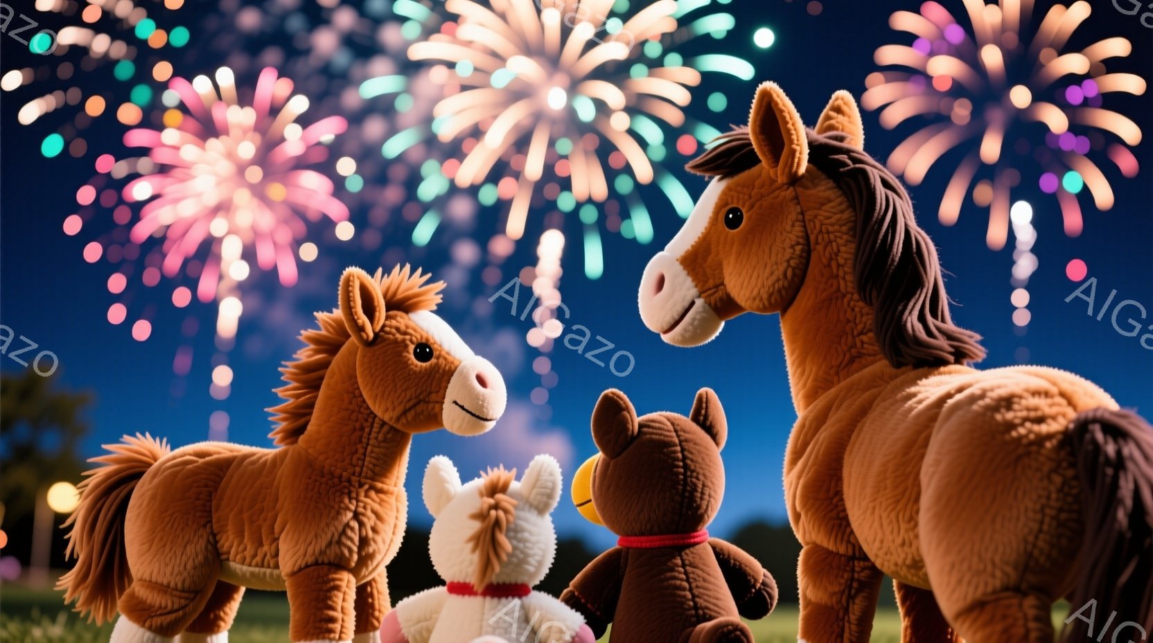 柔らかい茶色の毛並みを持つ三匹のぬいぐるみ馬が、緑の草の上に立っている。一番大きな馬は右側に立っており、左を見ている、中央の白い馬は小さく、両隣の馬を見上げている、一番小さい馬は左側に立って正面を見ている。背景は夜空で、鮮やかな花火が咲き乱れ、遠くにはぼんやりとした光が見える、全体的に暖かく、幻想的な雰囲気である。