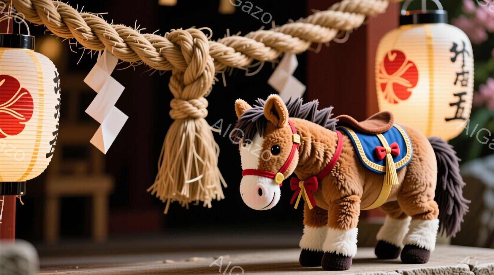 茶色と白の毛並みを持つ愛らしいぬいぐるみ馬が写っています。馬は赤い飾り紐と小さな茶色の蝶結びをつけており、穏やかな笑顔を浮かべています。背景には、提灯や飾り紐が飾られた神社の建物があり、厳かで落ち着いた雰囲気を醸し出しています。