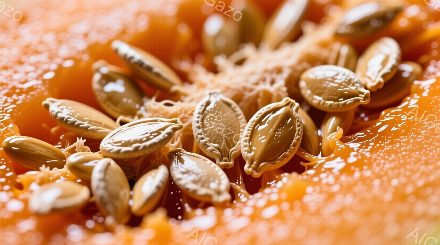 半分に切られたメロンが木製のテーブルの上に置かれています。メロンは独特の網目模様を持っており、果肉は鮮やかなオレンジ色をしています。背景にはぼやけた緑色の葉が見え、全体的に爽やかで食欲をそそる雰囲気です。