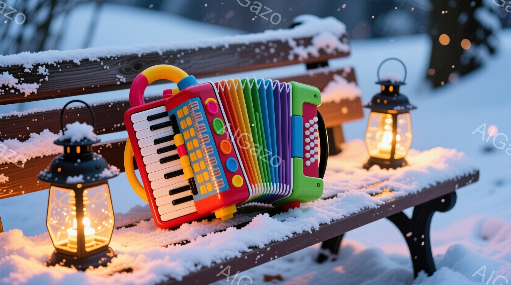 雪が降り積もったベンチの上に、カラフルな子供用の楽器、アコーディオンが置かれています。周囲には灯りが灯ったランタンが並び、冬の静寂な夜を照らしています。雪景色と暖かい光が組み合わさり、幻想的で温かい雰囲気を醸し出しています。