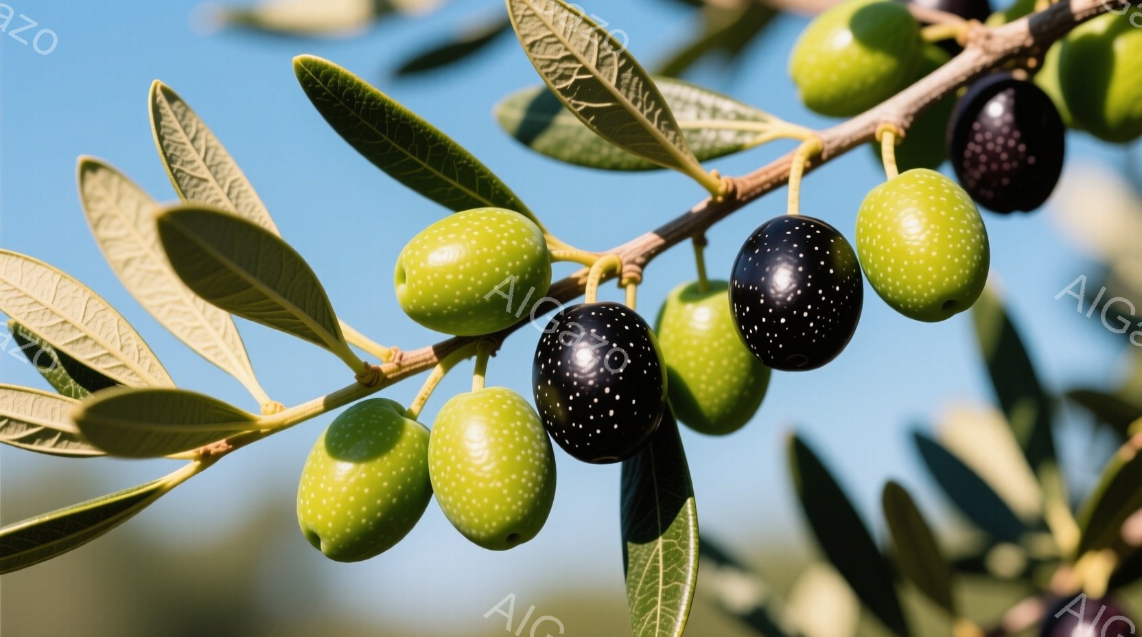 鮮やかな緑色のオリーブが二つ、枝についたまま写っている。オリーブの表面には水滴がつき、周囲にはオリーブオイルと思われる液体が滴り落ちている。背景は木製のマットのような質感で、全体的に自然で風味豊かな雰囲気を醸し出している。