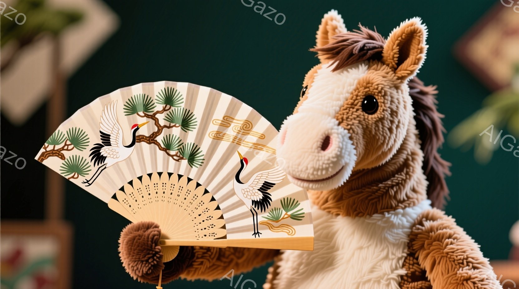 二匹のぬいぐるみ馬が畳の上に座っており、それぞれ濃い青色の着物と金色の帯を身に着けています。着物には白い花模様が描かれており、優雅な雰囲気を醸し出しています。背景には金色の花が描かれた黒塗りの屏風があり、日本の伝統的な美しさを感じさせます。