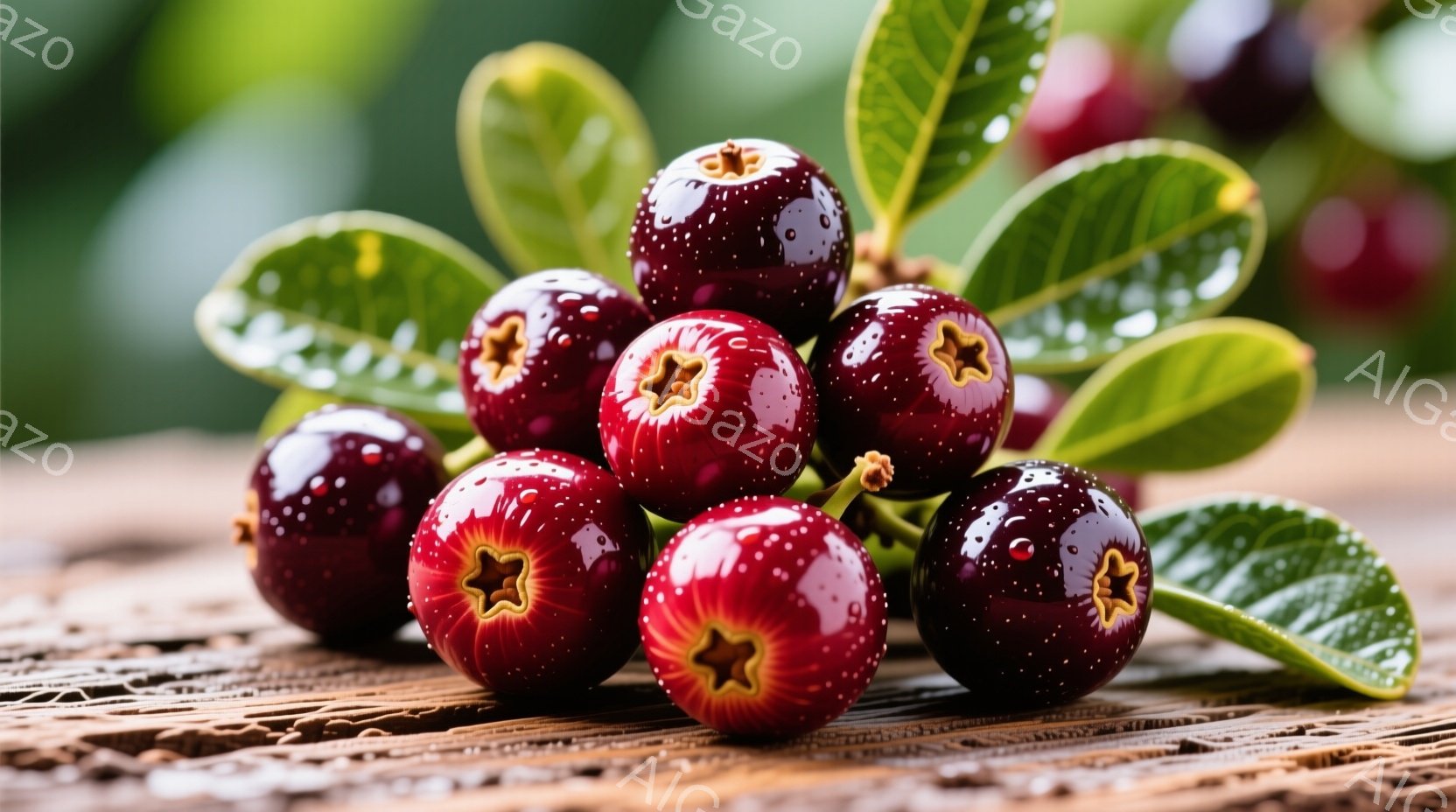 鮮やかなピンク色の果肉を持つ、途中で切られたパッションフルーツが2つ、木製の表面に置かれています。周りには緑の葉が生い茂り、フルーツの表面には水滴が光っています。背景はぼやけており、自然な光が差し込み、全体的に爽やかで美味しそうな雰囲気を醸し出しています。