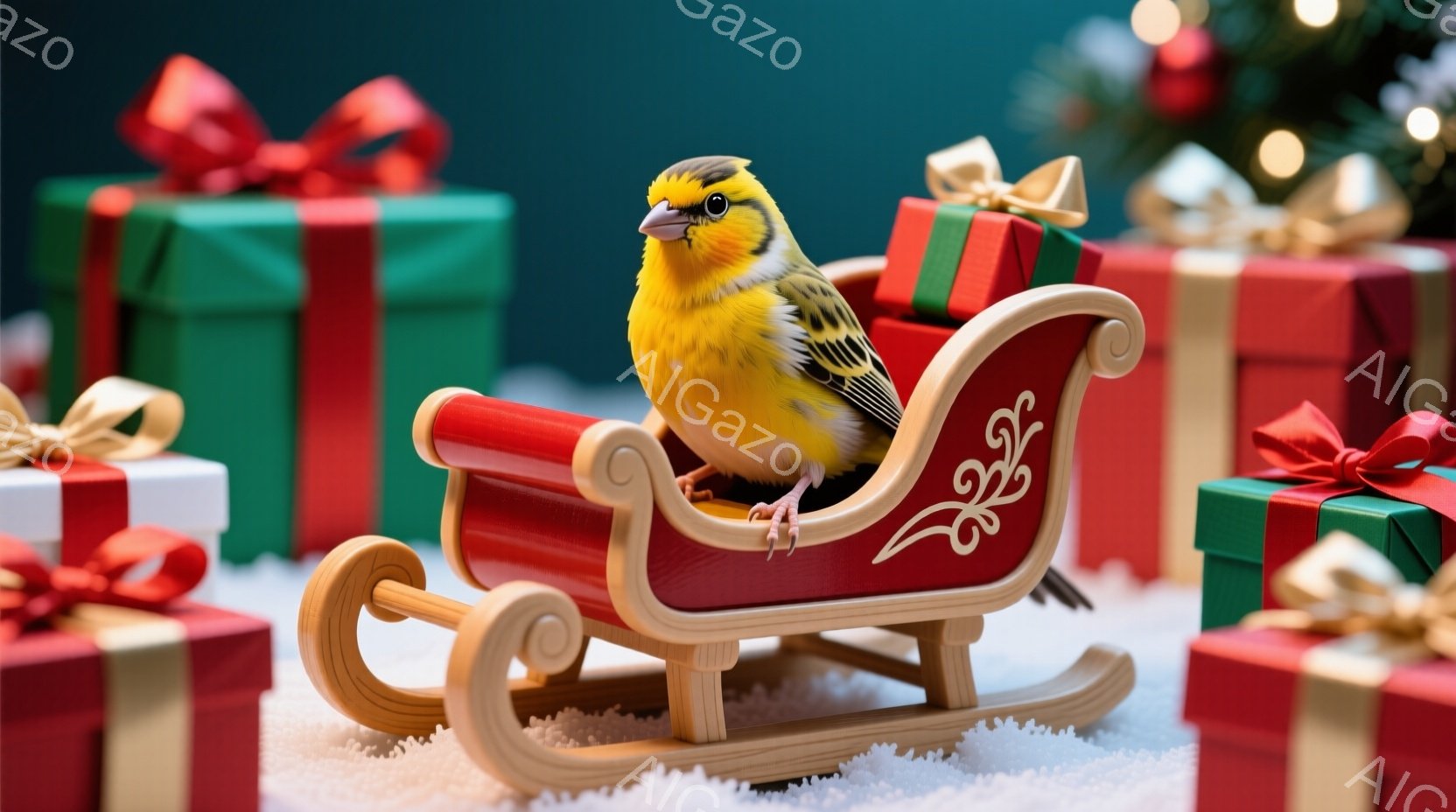 明るい黄色の鳥が、木製の赤いそりに座っています。背景には、赤と緑のプレゼントがいくつか置かれ、白い雪の上に並んでいます。全体的に、暖かく、お祝いの雰囲気で、クリスマスシーズンを連想させます。