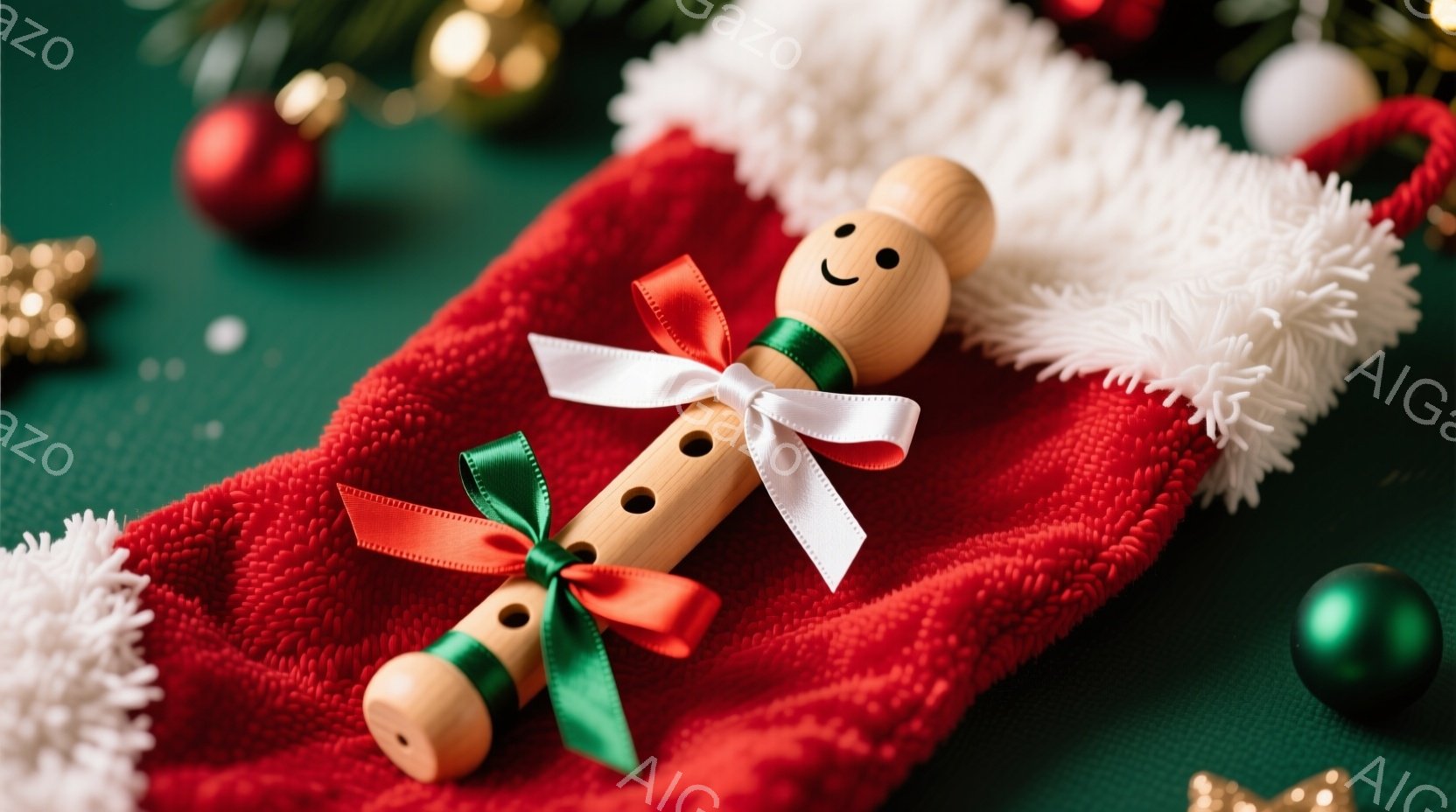 クリスマスツリーが飾られており、金色のサックスのオーナメントがいくつかぶら下がっています。赤いオーナメントやキラキラ光る飾りも点在し、背景はぼかして暖かく、お祝いの雰囲気を醸し出しています。全体的に、華やかで心地よいクリスマスの光景です。