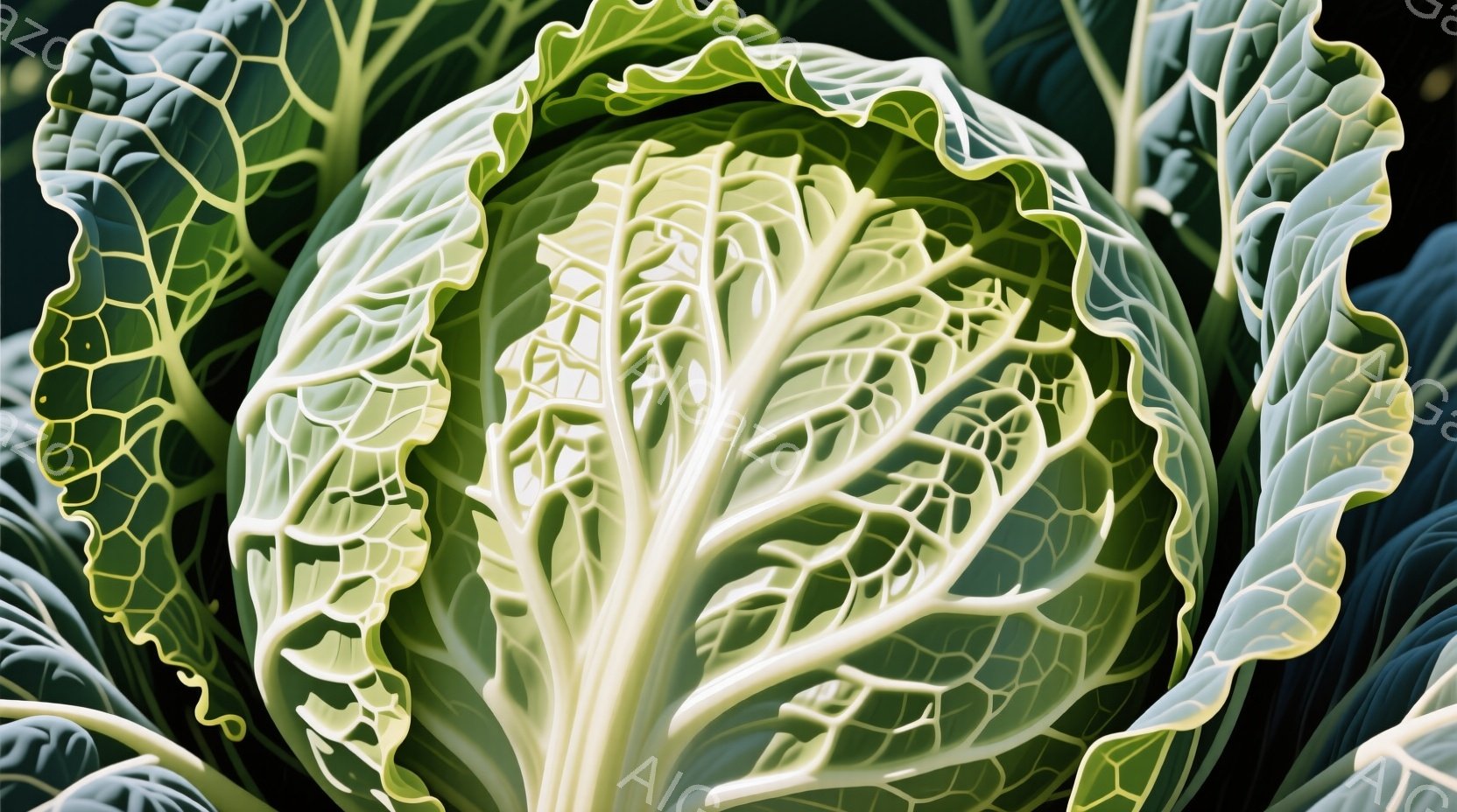 編まれたバスケットいっぱいのキャベツが写っています。キャベツは鮮やかな緑色で、葉脈がはっきりと見えます。バスケットは茶色で、影が長く伸びており、平らな明るいベージュ色の表面に置かれています。