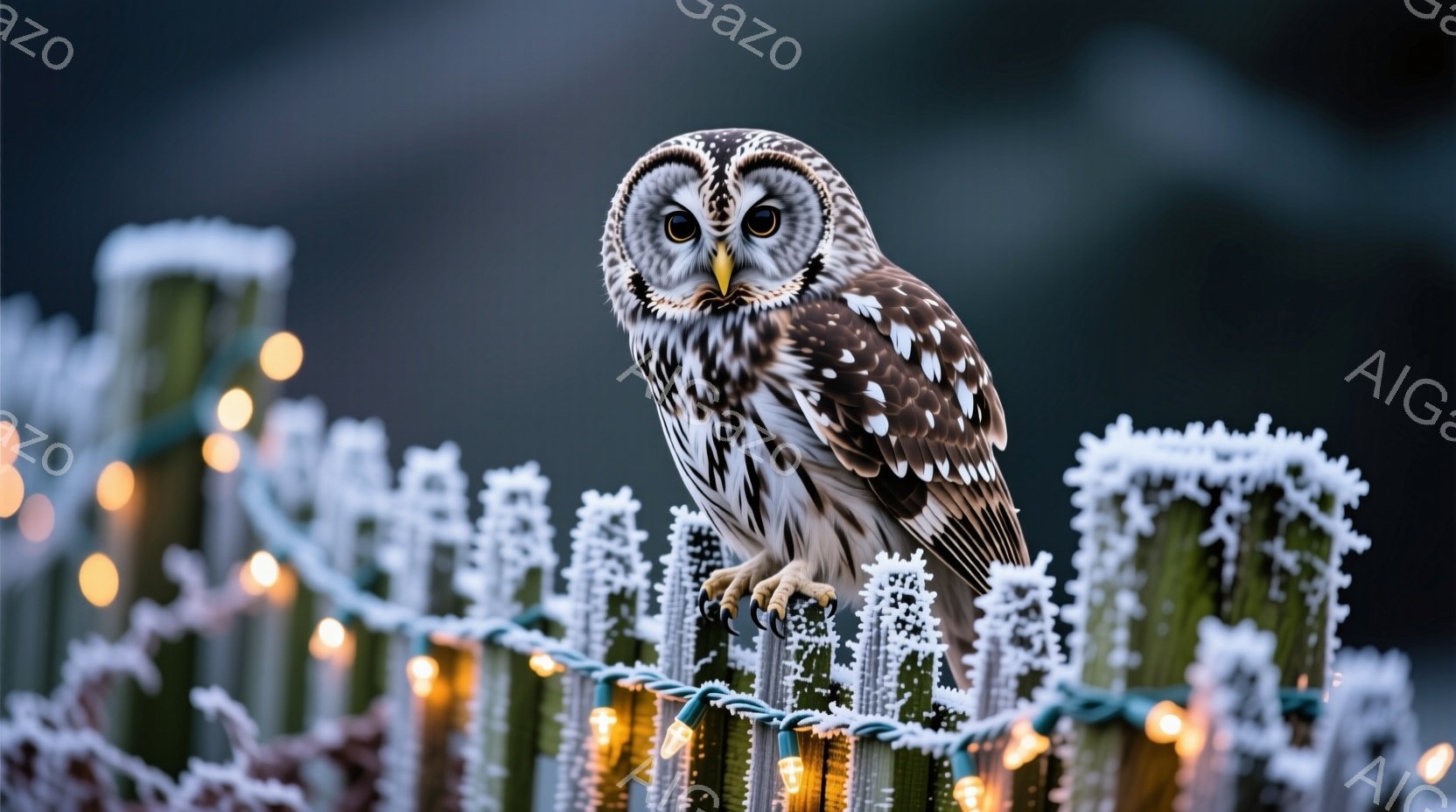 白い雪に覆われた柵の上に、美しいフクロウが止まっています。フクロウは鋭い眼差しで正面を見つめ、羽毛は茶色と白の美しい模様で覆われています。背景には暗い自然が広がり、柵に飾られた温かい光が、冬の寒さを和らげるような雰囲気を醸し出しています。