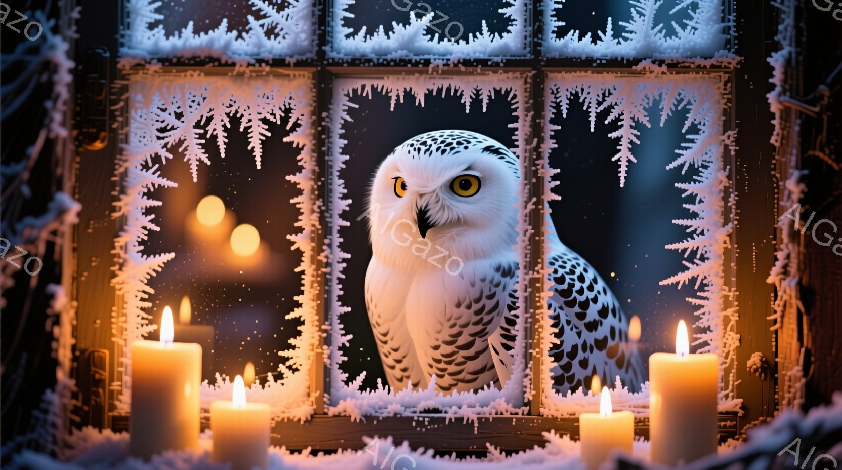 雪に覆われた屋根の上に、大きなフクロウが堂々と座っています。背景には、点灯したクリスマスライトで飾られたモミの木とレンガ造りの煙突が見え、雪が舞う冬の夜空が広がっています。フクロウは鋭い眼光で正面を見つめ、凛とした雰囲気を醸し出しています。