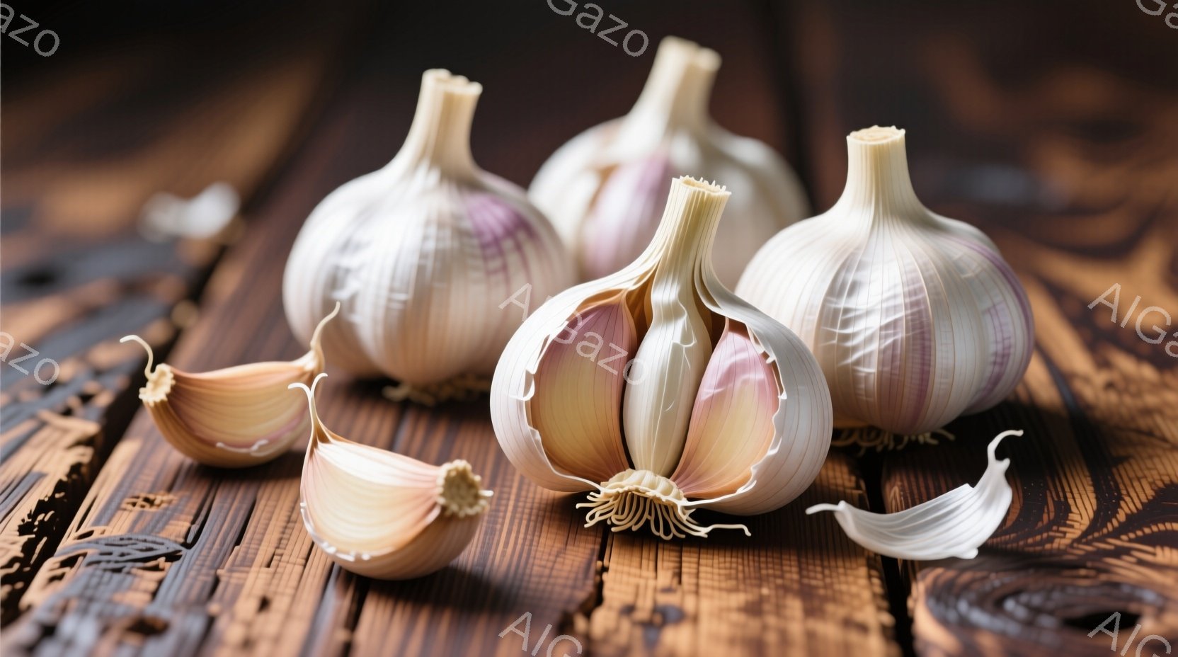 茶色い木製の板の上にニンニクの球根がいくつか置かれています。そのうちの一つは半分に割られており、内部の白い爪が露出しています。全体的に暖色系の色調で、素朴で自然な雰囲気を醸し出しています。