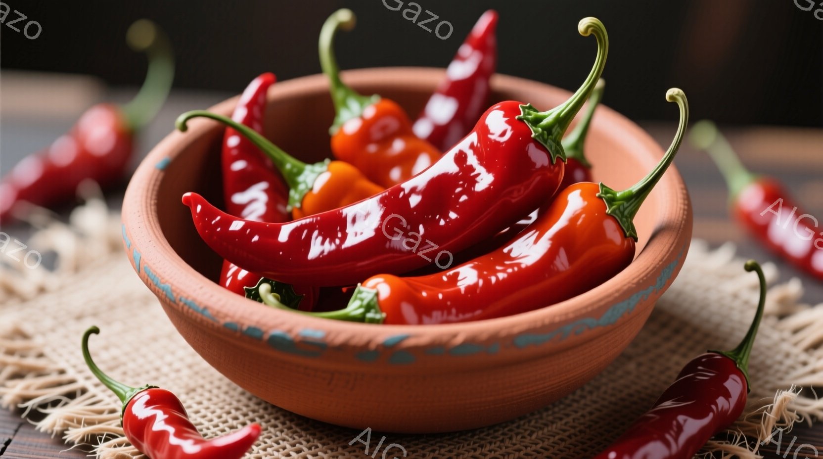鮮やかな赤色の唐辛子が、素朴な陶器のボウルに山のように盛られています。背景には木製のテーブルと、麻布のような素材が見え、全体的に暖かく、家庭的な雰囲気を醸し出しています。唐辛子のつややかな質感が、美味しさを引き立てています。