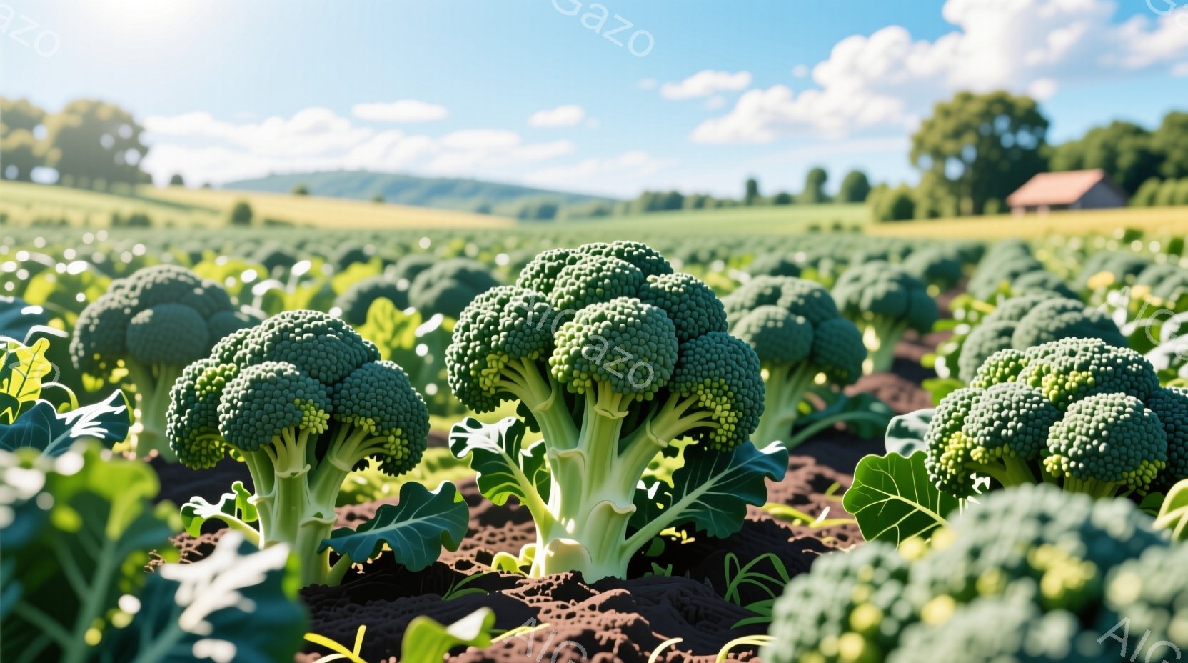 広大な畑にブロッコリーが密集して生えています。背景には緑の丘と、霞んだ遠くの山々が広がっており、晴れた日の穏やかな光が差し込んでいます。土の色とブロッコリーの鮮やかな緑色が印象的で、自然の豊かさを感じさせる一枚です。