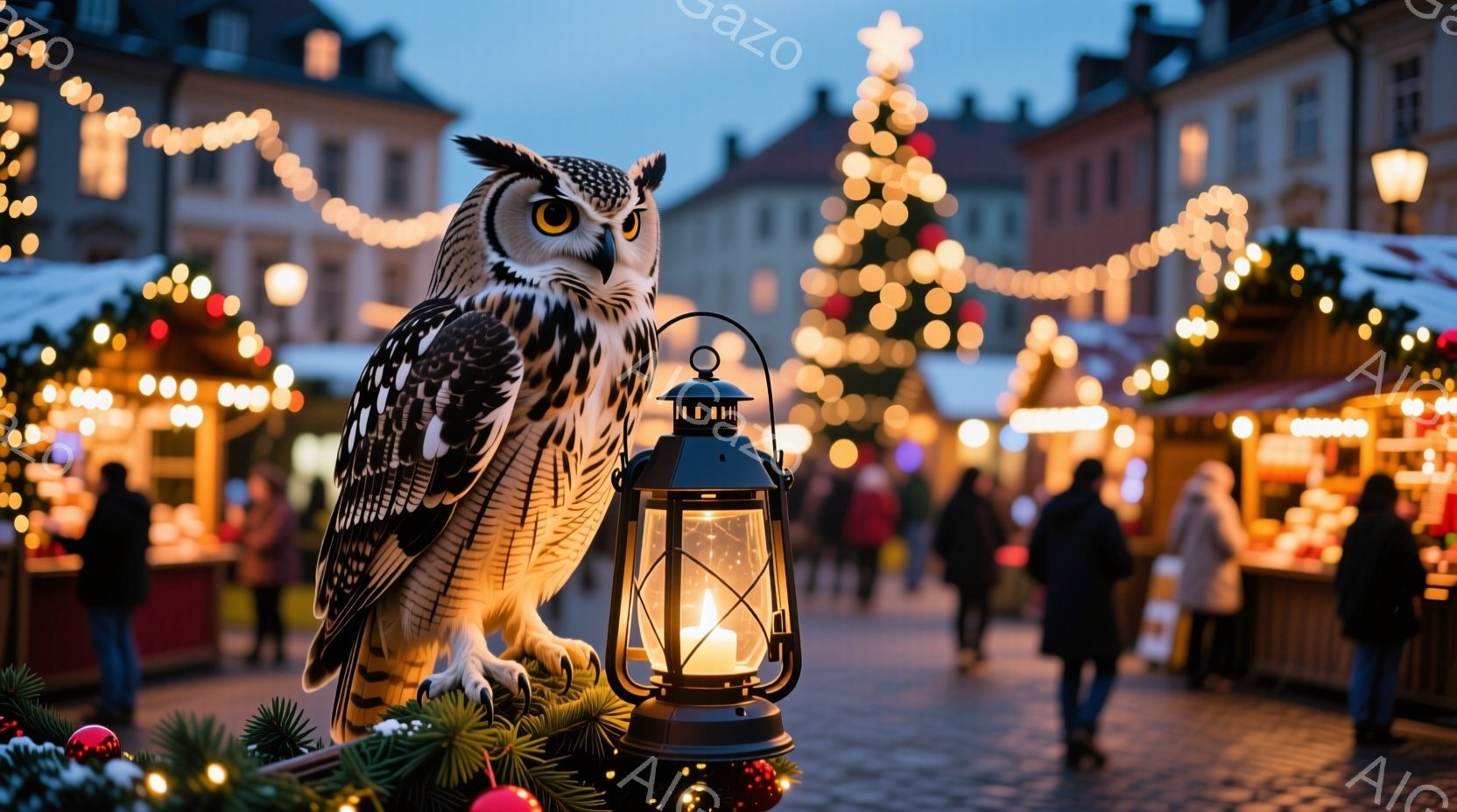 賑やかなクリスマスマーケットの風景の中に、一羽のフクロウがランタンの上に止まっています。フクロウは鋭い眼差しで正面を見つめ、その羽は細部まで緻密に描かれています。背景には、ライトアップされた建物や賑わう人々が見え、冬の暖かく華やかな雰囲気を醸し出しています。