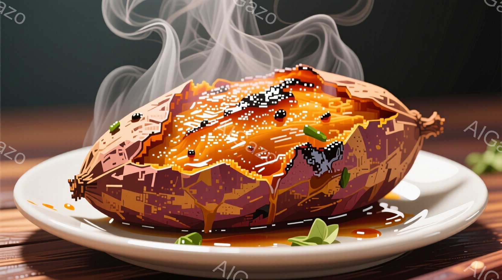 焼き芋が白いお皿に盛られ、蜜が全体に流れ落ちています。蒸気が立ち上り、焼き芋の甘くて温かい香りが伝わってきます。背景は木目調で、少し緑色の葉がアクセントになっています。