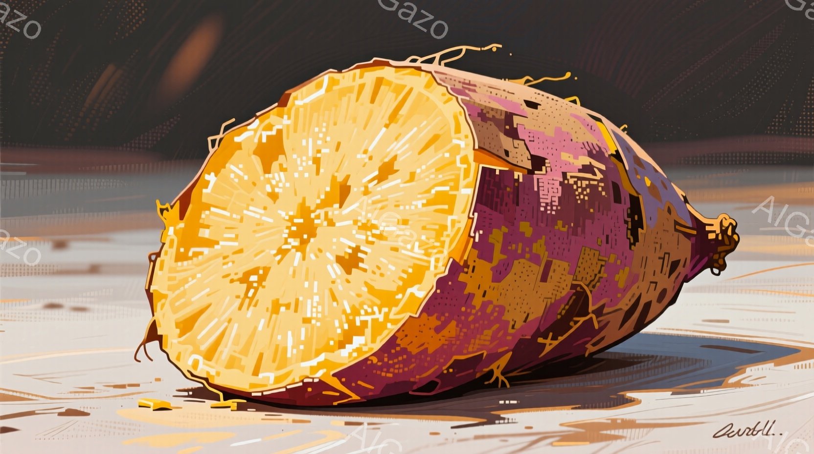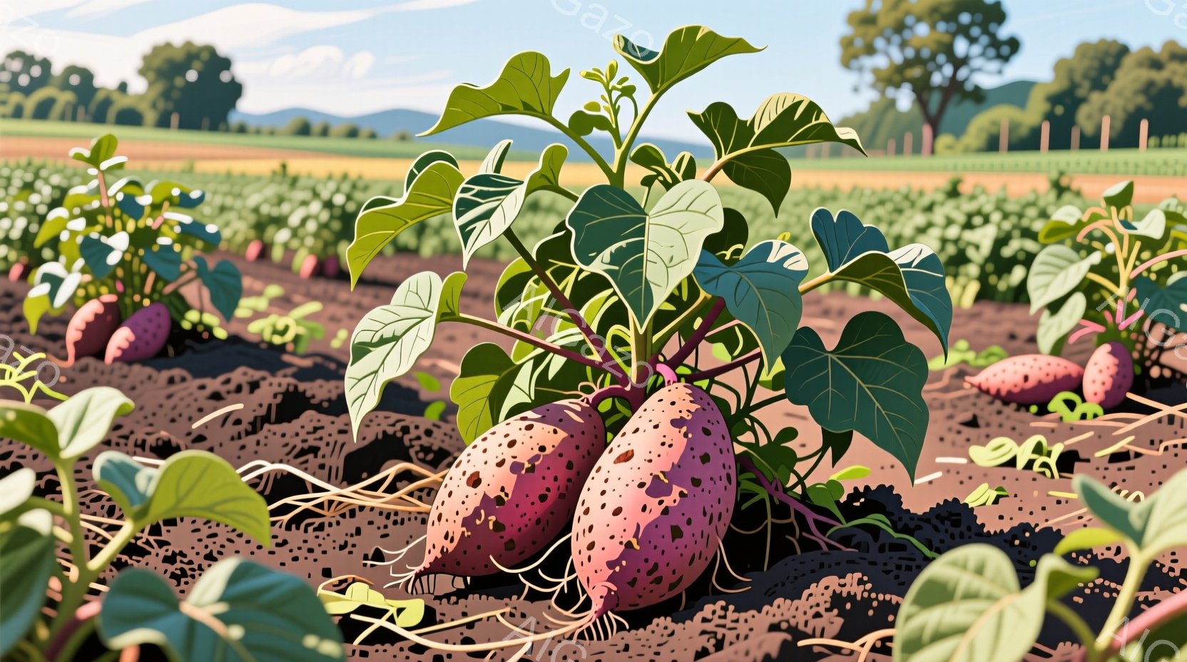 畑にはサツマイモが育っており、緑の葉と土から顔を出す赤い実が印象的です。背景には黄金色の麦畑が広がり、遠くには緑豊かな丘と青空が広がっています。全体的に明るく、穏やかな雰囲気で、収穫の喜びを感じさせる風景です。