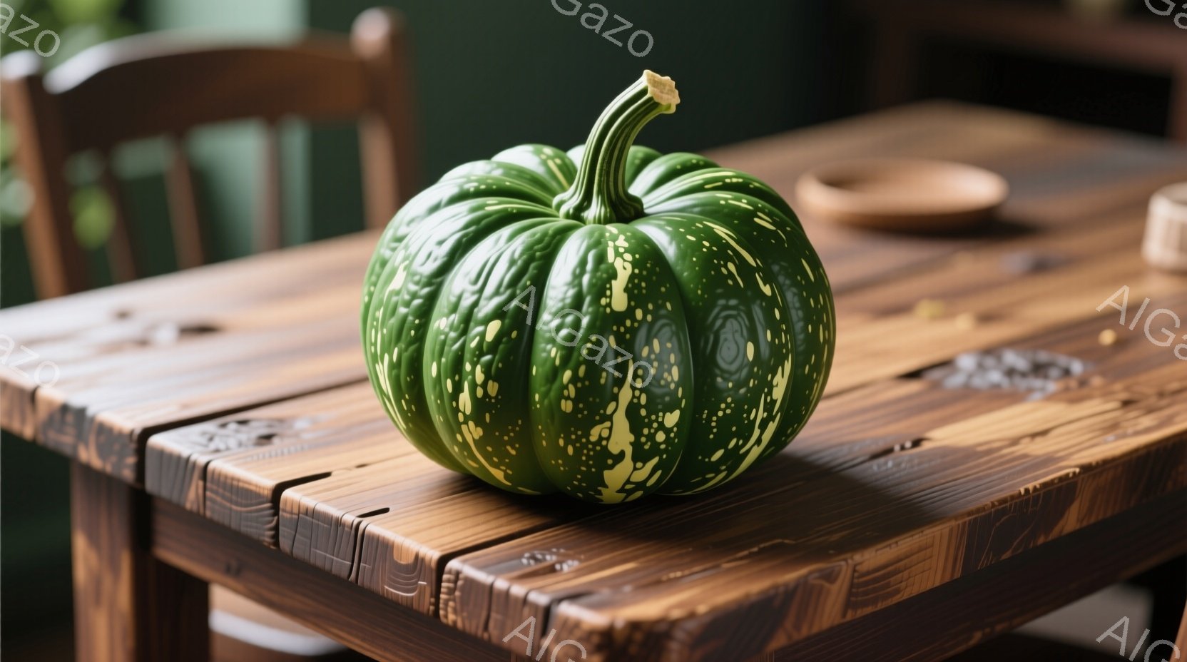 切り開かれた大きなカボチャが、茶色の木製のテーブルの上に置かれています。カボチャの断面からは、オレンジ色の種がぎっしりと詰まった内部が露出し、秋の収穫の季節を感じさせます。背景は暗く、カボチャの鮮やかな色が際立っています。
