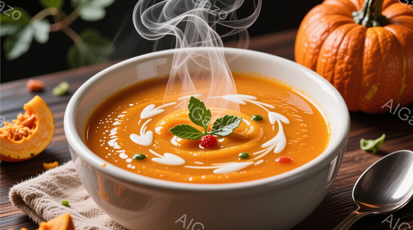 白い器に、オレンジ色のスープが湯気を上げている。器の中央にはパセリが飾られ、スープの表面には白いクリームが渦巻き状に描かれている。背景には、ハロウィンを連想させるカボチャが2つと、自然な風合いの布が敷かれている。