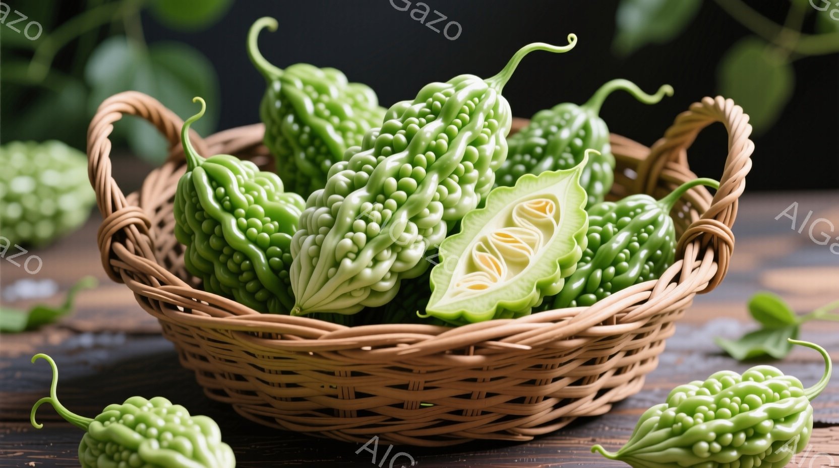 籐で編まれたかごに、緑色の苦瓜(ゴーヤ)がぎっしりと詰まっています。木製のテーブルの上に置かれており、背景はぼやけていますが、緑の葉っぱが見えます。全体的に、新鮮な野菜の収穫を表現した、素朴で自然な雰囲気です。
