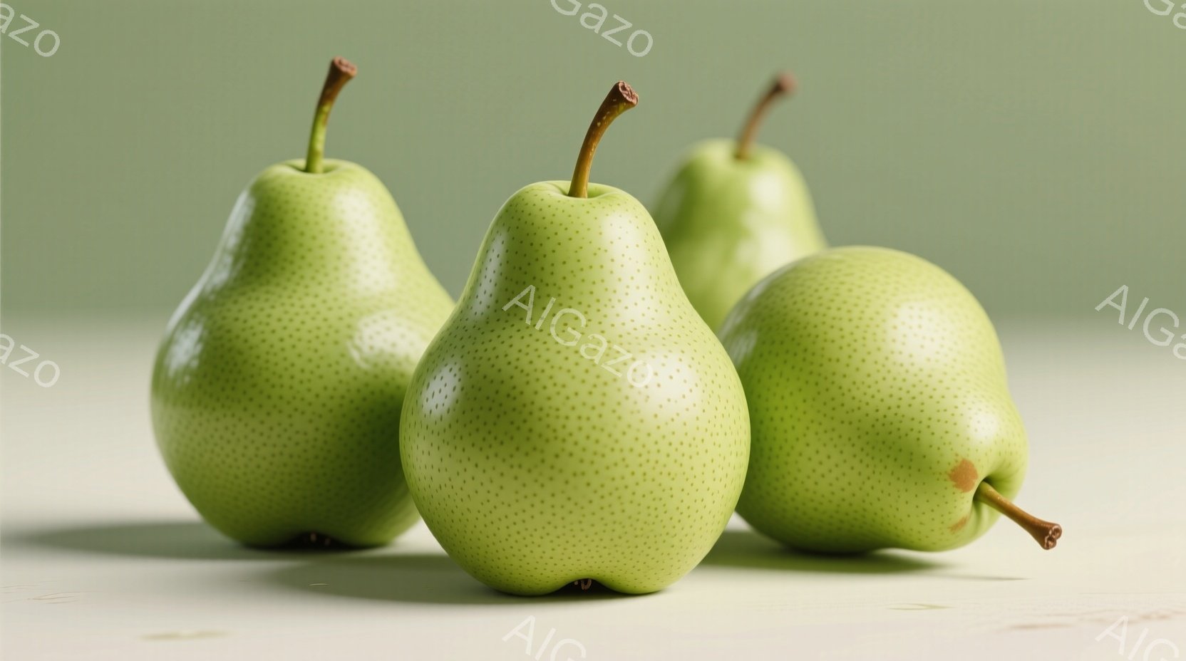 鮮やかな緑色の梨が三つ、薄いベージュ色の背景に並んでいます。梨はそれぞれ丸みを帯びた形をしており、表面には細かい粒状の模様が見られます。影が柔らかく、全体的に穏やかで自然な雰囲気を醸し出しています。