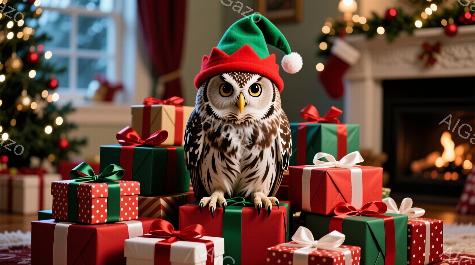ふわふわのフクロウが、クリスマスプレゼントの山の上に座っており、赤いサンタの帽子をかぶっています。フクロウは真剣な表情で正面を見つめており、鋭い爪をプレゼントの上に置いています。背景にはクリスマスツリーや暖炉が見え、祝祭の暖かい雰囲気を感じさせます。
