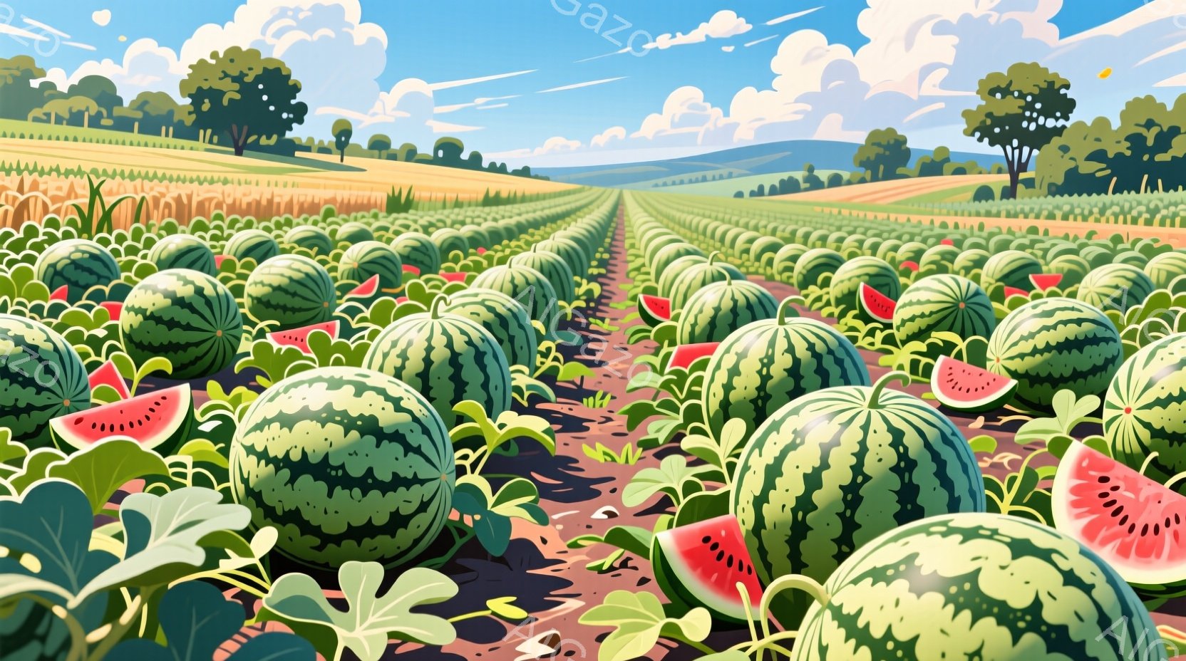 広大なスイカ畑が描かれており、緑色の縞模様のスイカが密集して並んでいます。畑は整然と区画分けされ、遠景には緑豊かな木々と黄色い畑が広がっています。晴れた空には白い雲が浮かび、明るく穏やかな夏の日の雰囲気が漂っています。