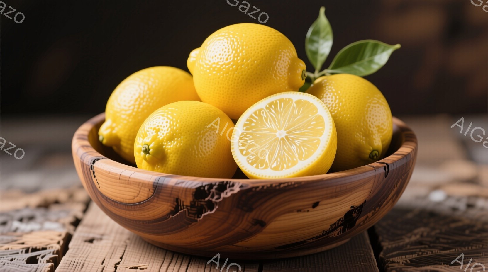 木のボウルにレモンがいくつか入っており、鮮やかな黄色が目を引きます。レモンの周りには緑色の葉が添えられ、さらに半分に切られたレモンが一つ、ボウルの外側に置かれています。背景は木製のテーブルで、温かく自然な雰囲気を醸し出しています。