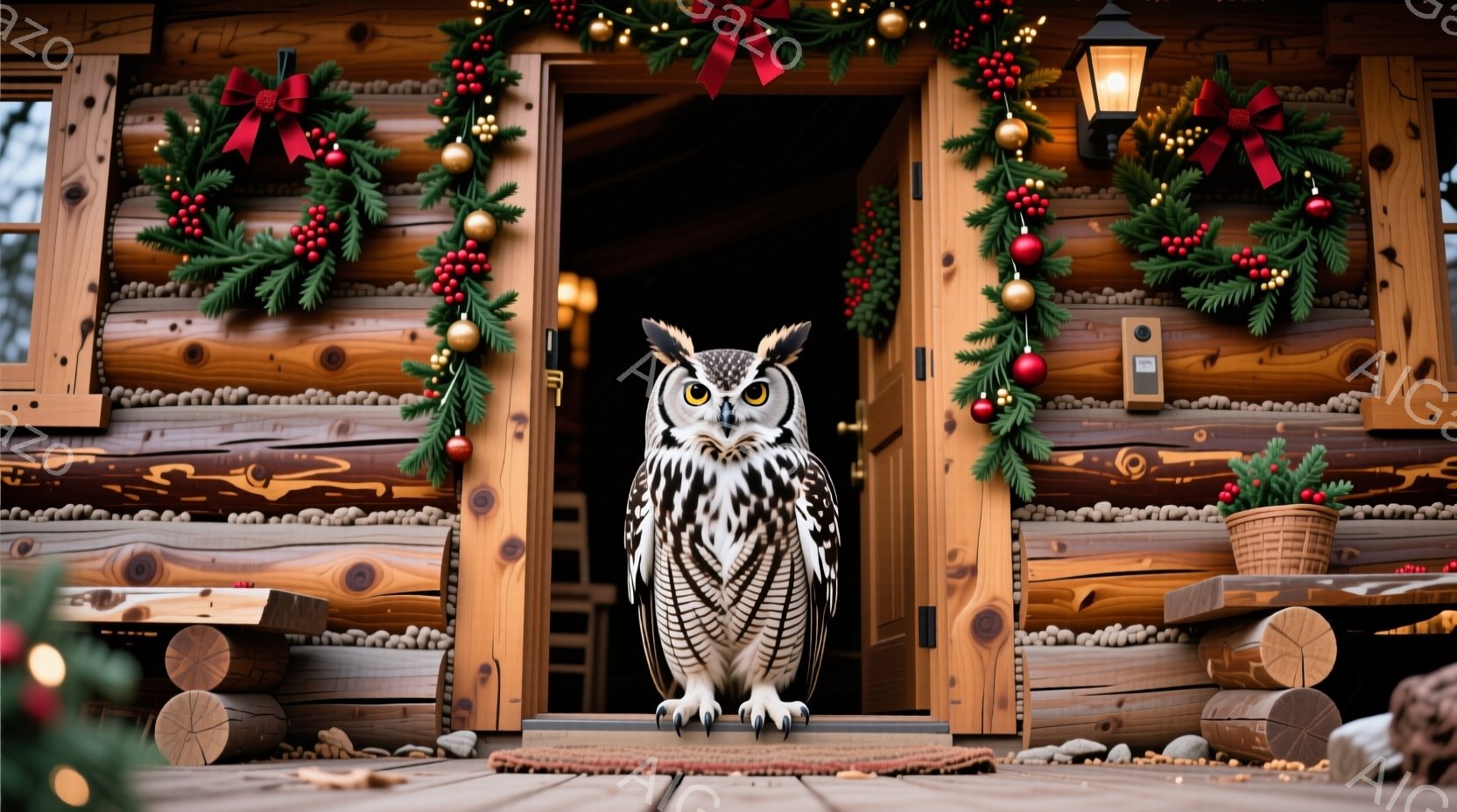 ログハウスの入り口に、立派な白いフクロウが堂々と立っている。入り口はクリスマス風の装飾で飾られ、赤いリボンと緑の葉が暖かく、お祝いの雰囲気を醸し出している。背景には、木製の壁と自然な木材が積み重ねられ、冬の静けさと暖かさを感じさせる。