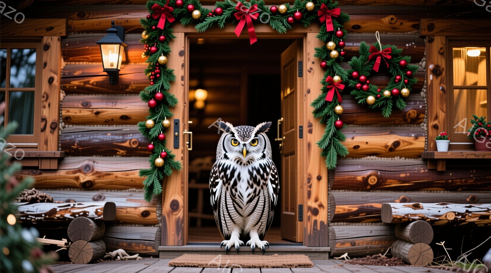 雪の降る冬の丸太小屋の前に、大きなフクロウが立っている。クリスマスの飾り付けが施された丸太小屋のドアは開いており、暖かな光が漏れている。フクロウは正面を向き、鋭い眼光でじっと見つめている様子は、威厳と静けさを感じさせる。