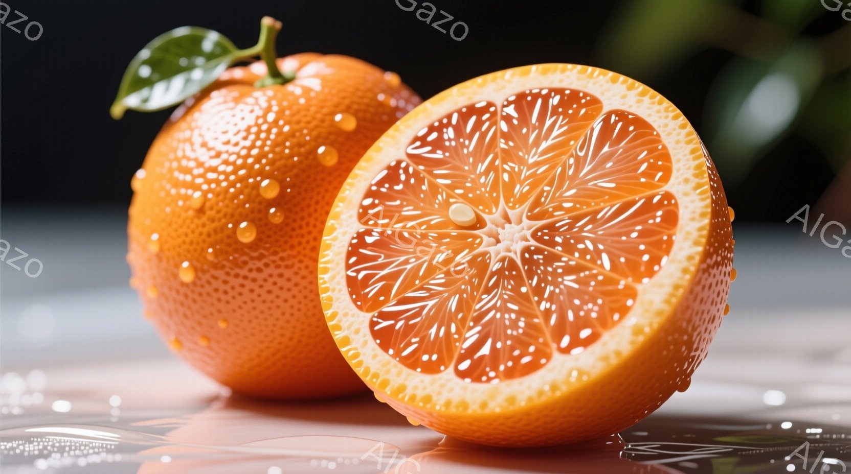 みずみずしいオレンジが2つ、光沢のある白い表面に置かれています。一つは丸ごとで水滴がつき、もう一つは半分にカットされており、果肉の鮮やかなオレンジ色が際立っています。背景は暗く、オレンジの明るい色と水滴が強調され、爽やかで健康的な雰囲気を醸し出しています。