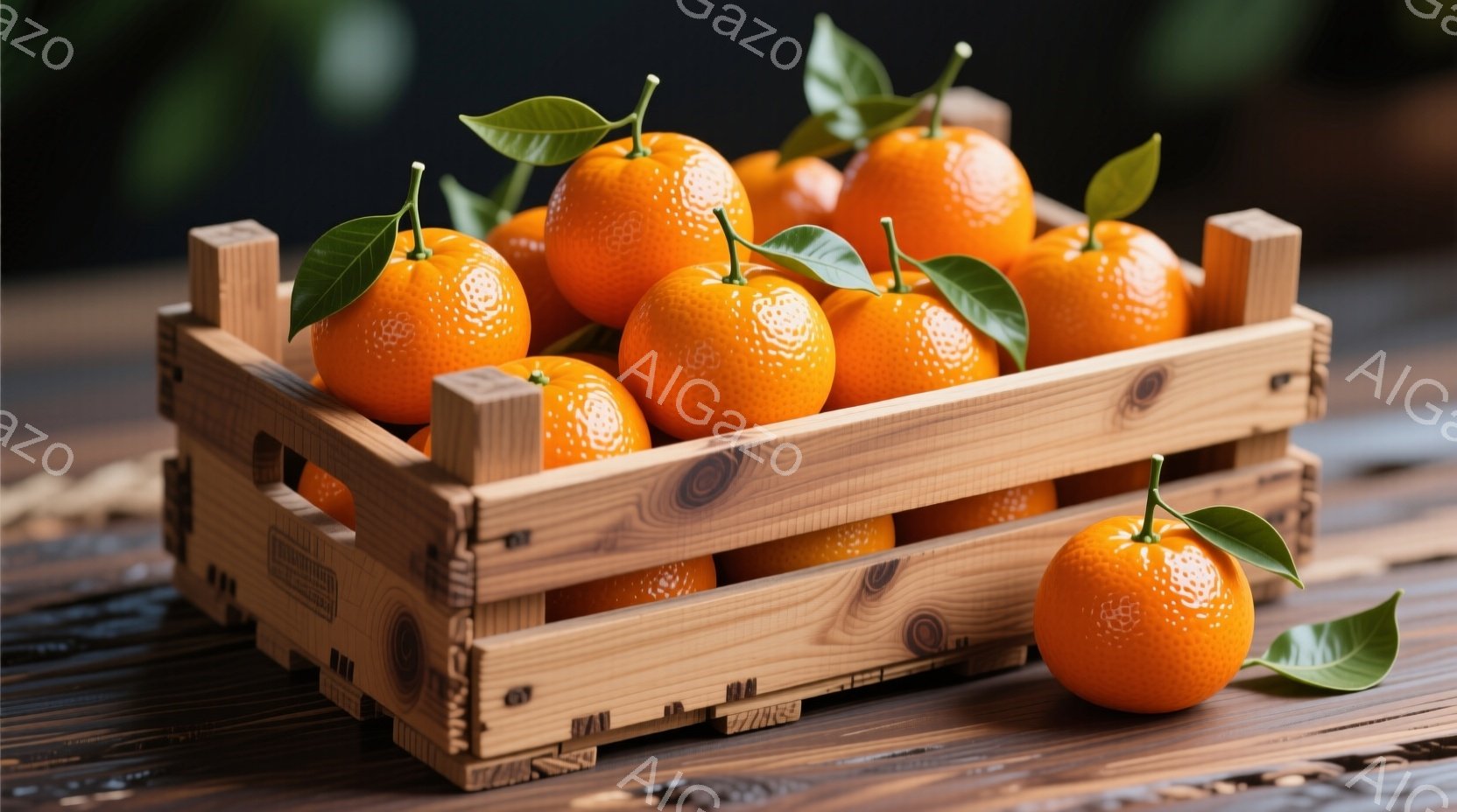 鮮やかなオレンジが木製の箱にぎっしりと詰まっています。葉が付いたオレンジと、半分にカットされたオレンジがいくつか見え、新鮮さと美味しさを感じさせます。箱は木製のテーブルの上に置かれ、全体的に暖かく、自然な雰囲気を醸し出しています。