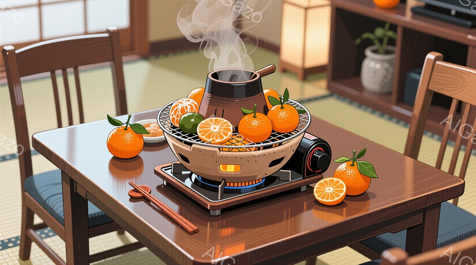温かい色合いのミカンが、卓上コンロで焼かれている様子が描かれている。木製のテーブルの上には、ミカン、お茶碗、箸、焼き網、そしてコンロが配置されており、日本の家庭的な雰囲気が漂っている。背景には畳と木製の棚があり、暖かく穏やかな冬の日の情景を思わせる。
