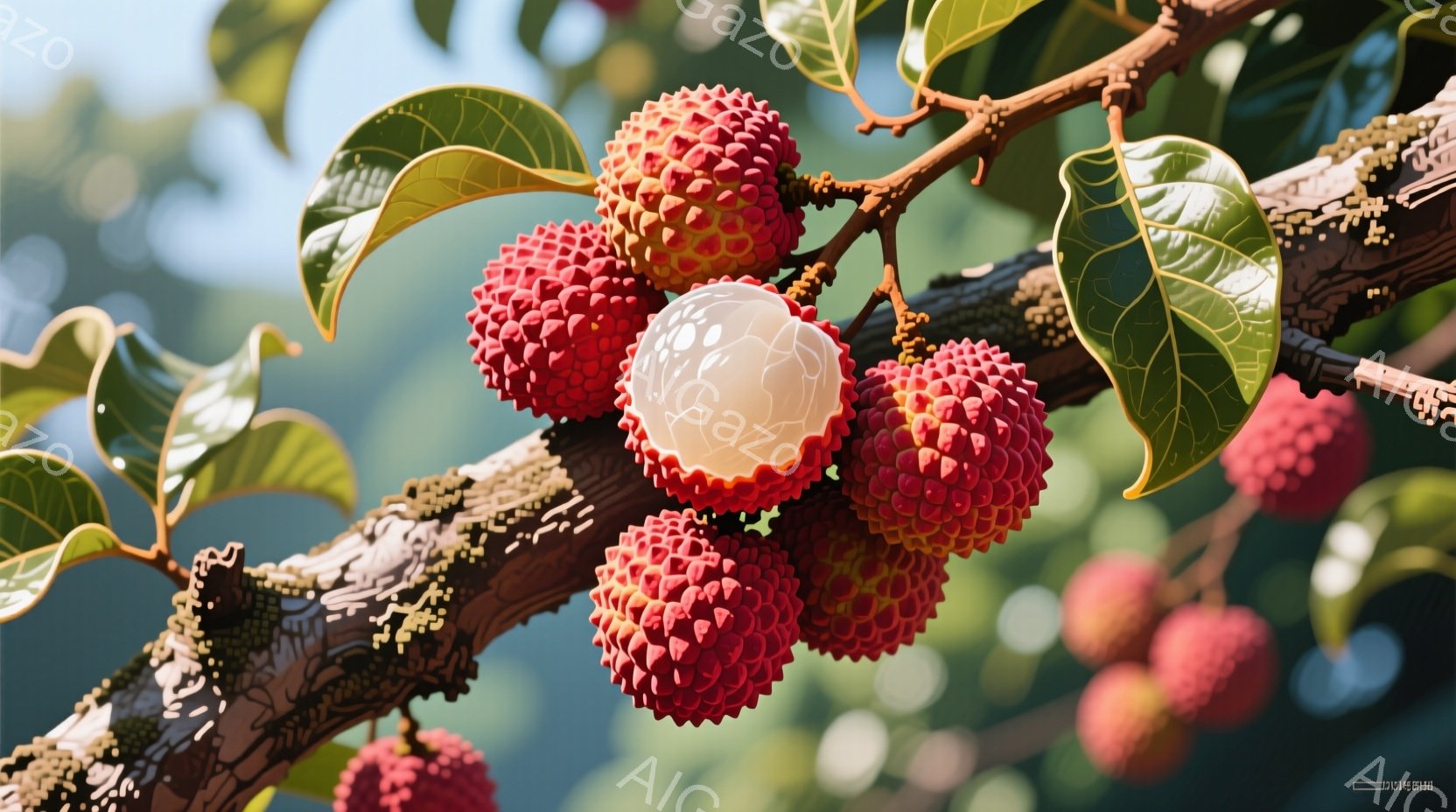 枝にライチが密集して実っています。鮮やかな赤色の果実は、ゴツゴツとした皮で覆われ、緑色の葉に囲まれています。背景は明るい空とぼやけた緑で、夏の太陽の下で実るライチの活気ある雰囲気を伝えています。