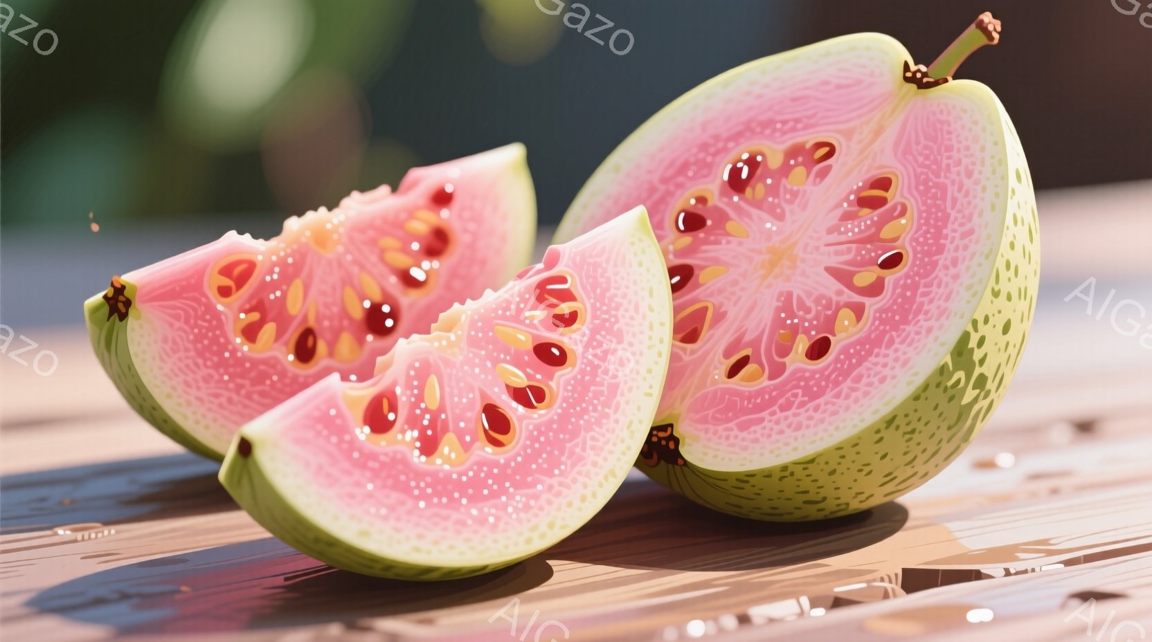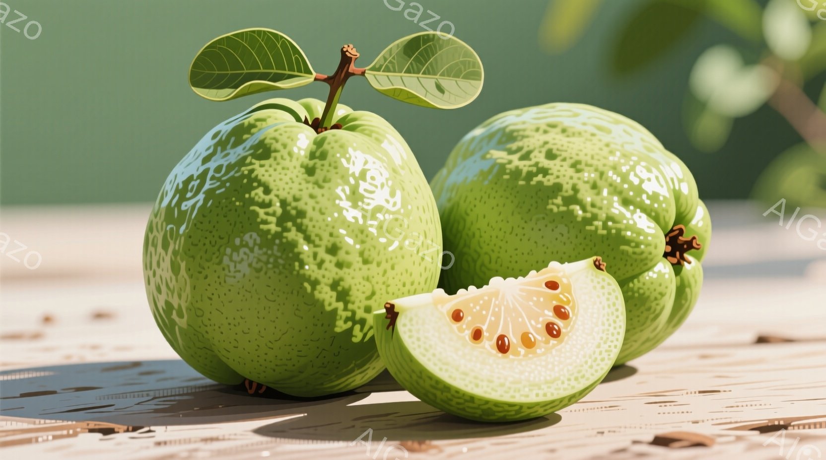 この無料AI生成画像「鮮やかな緑色の番石榴が3つ、白い背景に置かれています。一つは半分にカットされており、ピンク色の種子が詰まった果肉が露わになっています。葉は濃い緑色で、質感と立体感が強調されています。」は、2025年10月23日に作成されました。 サイズは 1664×928px の高解像度で、商用利用も可能なフリー素材として提供しています。