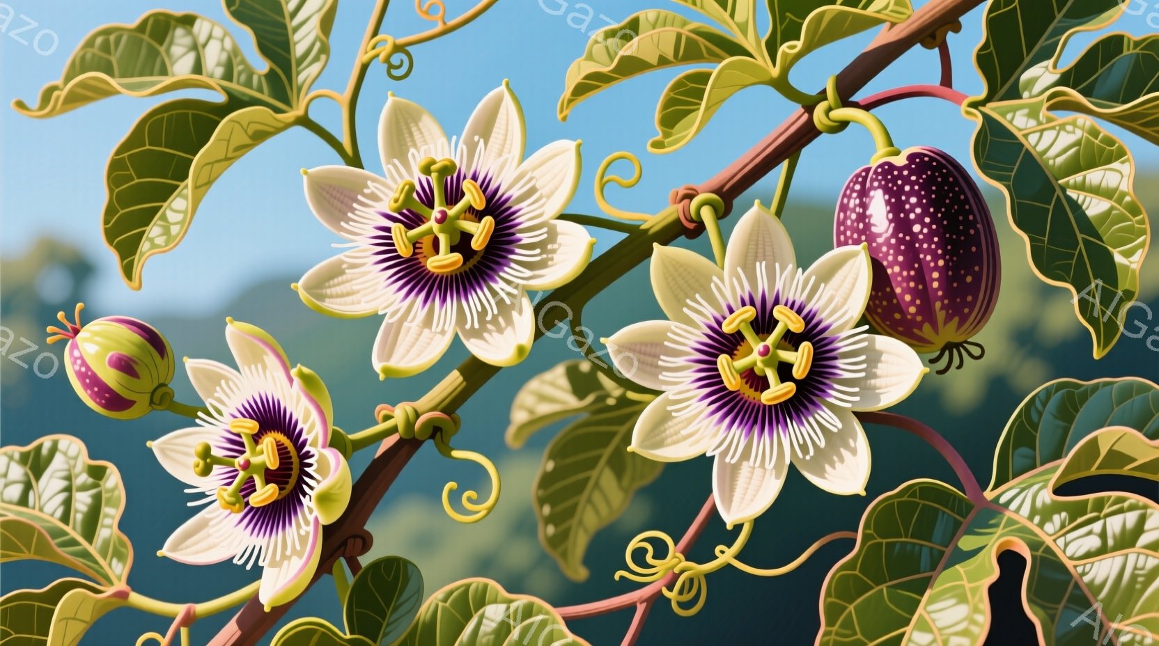 熱帯のつる植物が画面いっぱいに広がっており、白と紫色の複雑な花と、赤紫色の丸い果実が特徴的です。背景には緑豊かな丘陵地帯がぼんやりと見え、穏やかな晴天を示唆しています。鮮やかな色彩と細部にわたる描写が、生命力あふれる自然の美しさを際立たせています。