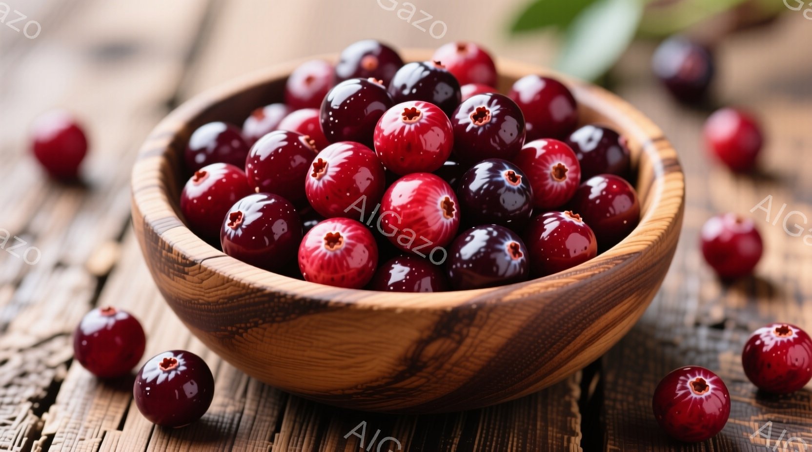 艶やかな赤色のクランベリーが、木製のボウルにたっぷりと盛られています。背景は木目が見える粗いテーブルで、自然な雰囲気を醸し出しています。全体的に、収穫の喜びや秋の温かさを感じさせる、素朴で魅力的な光景です。