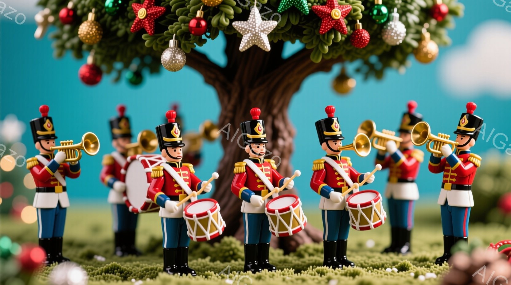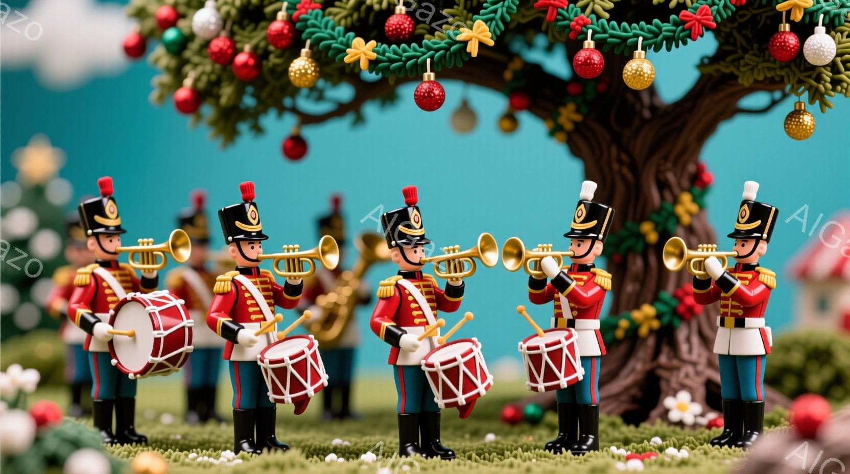 兵隊のミニチュア人形たちが整列し、トランペットやドラムを演奏している様子が描かれています。彼らは赤いジャケットに黒いズボン、そして特徴的な帽子を着用し、真剣な表情で楽器を手に持っています。背景にはクリスマスツリーのような装飾と、緑色の芝生のような地面が広がっており、お祭りや祝賀の雰囲気が漂っています。
