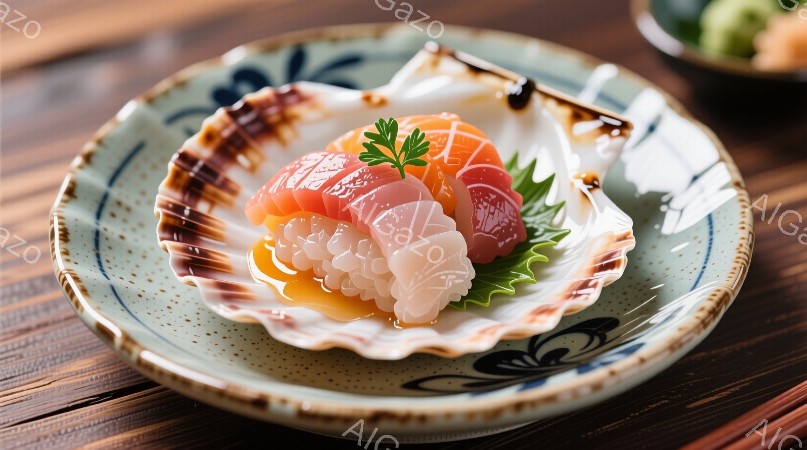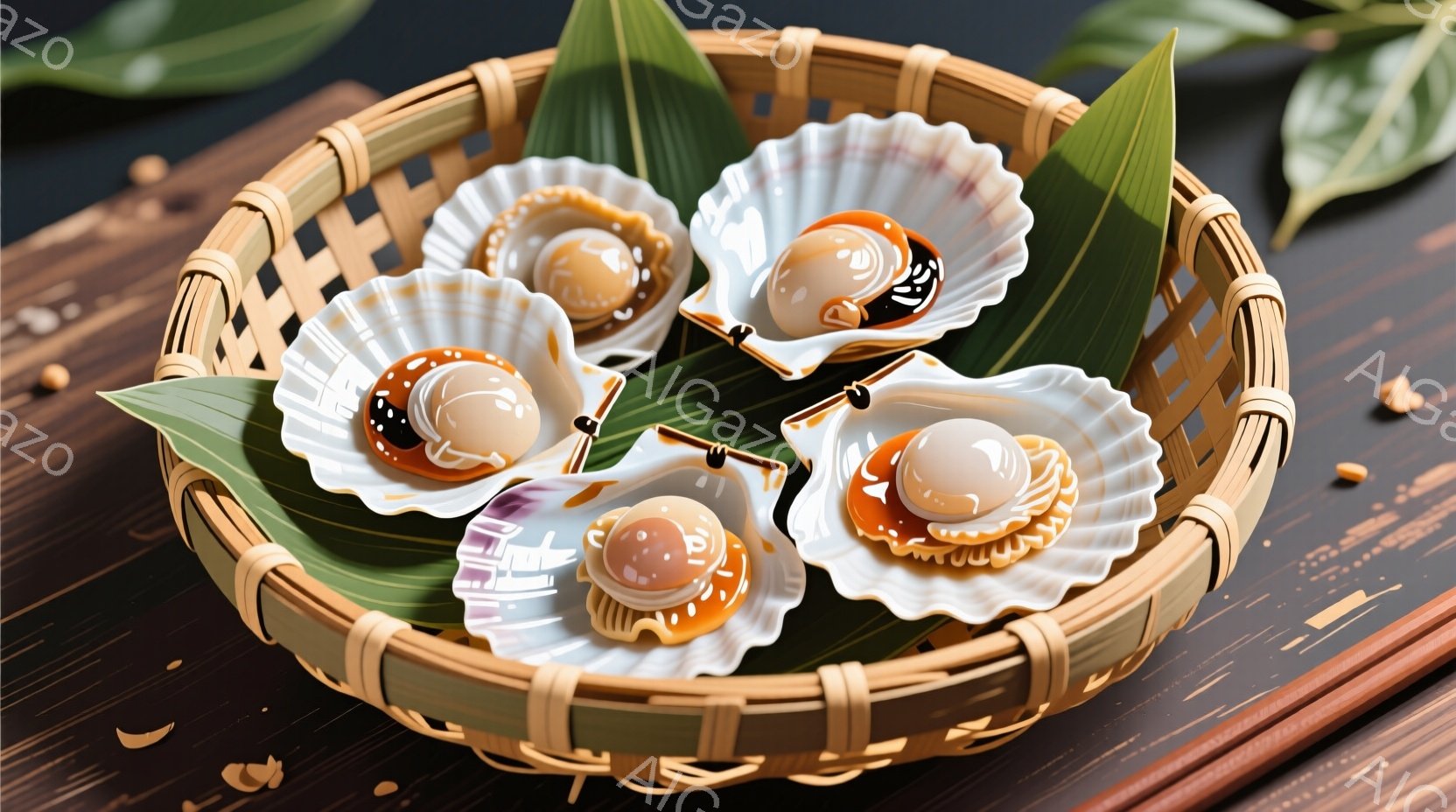 この無料AI生成画像「鮮やかな真珠のような団子を、美しい貝殻に乗せた料理の写真です。籐編みの円形の器に、緑色の葉と茶色のナッツが添えられ、黒い背景に置かれています。上品で洗練された雰囲気で、日本料理または特別な機会のための料理を連想させます。」は、2025年10月23日に作成されました。 サイズは 1664×928px の高解像度で、商用利用も可能なフリー素材として提供しています。